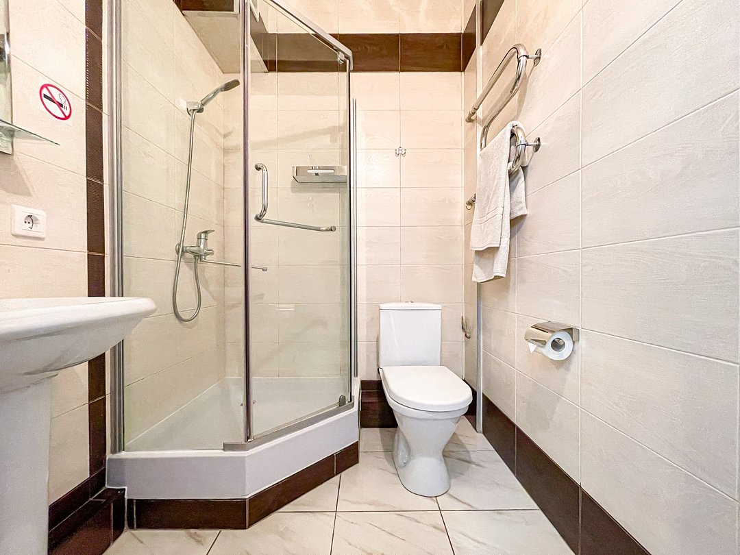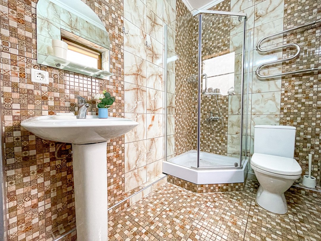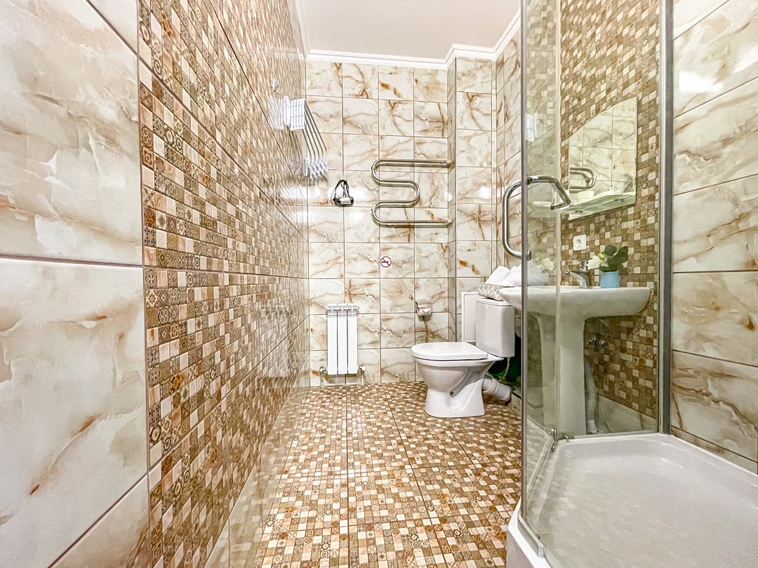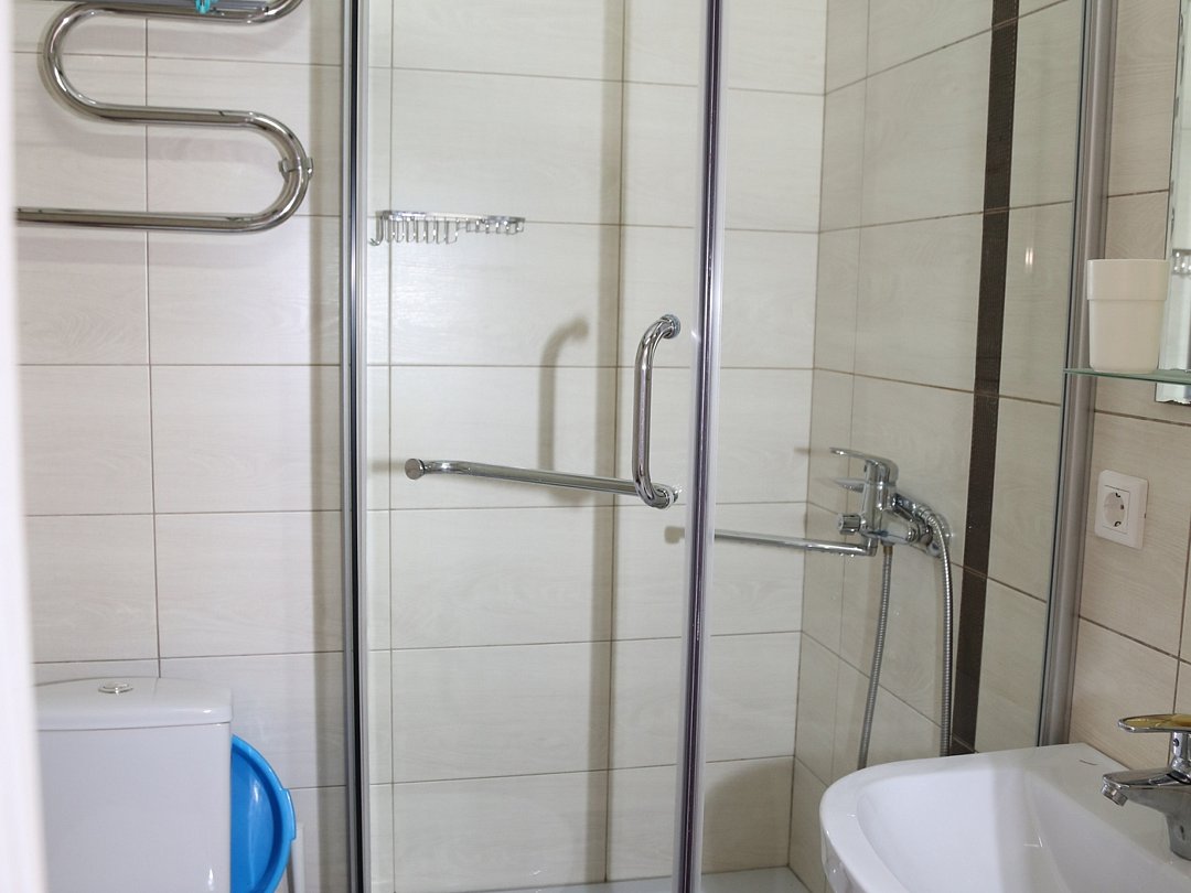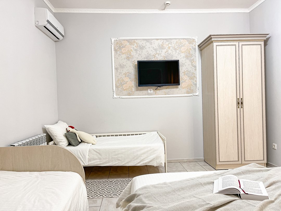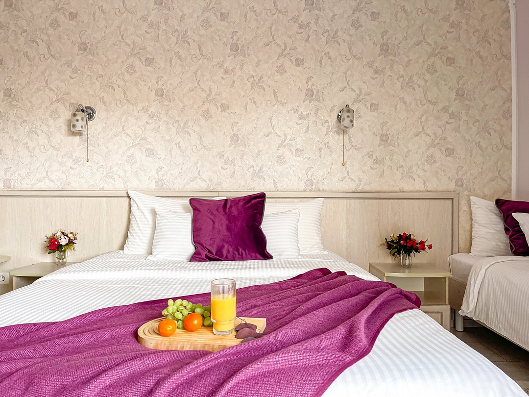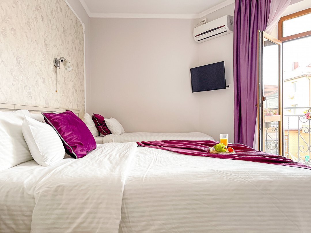 улучшенный трехместный номер Номер с балконом: двуспальная и односпальная кровати с ортопедическим матрацами, телевизор, WI-FI, холодильник, чайник, сплит-система, набор посуды, шкаф для одежды, стол, стулья, постельные принадлежности. Ванная комната: душевая кабина, санузел, туалетные принадлежности, набор полотенецВ номере