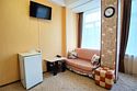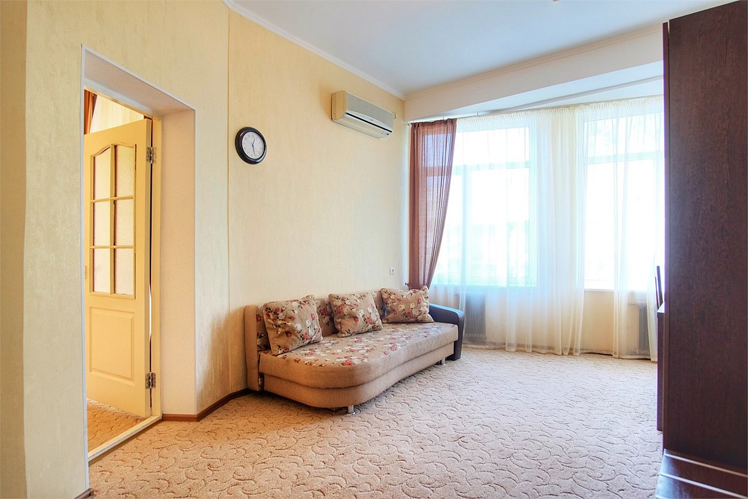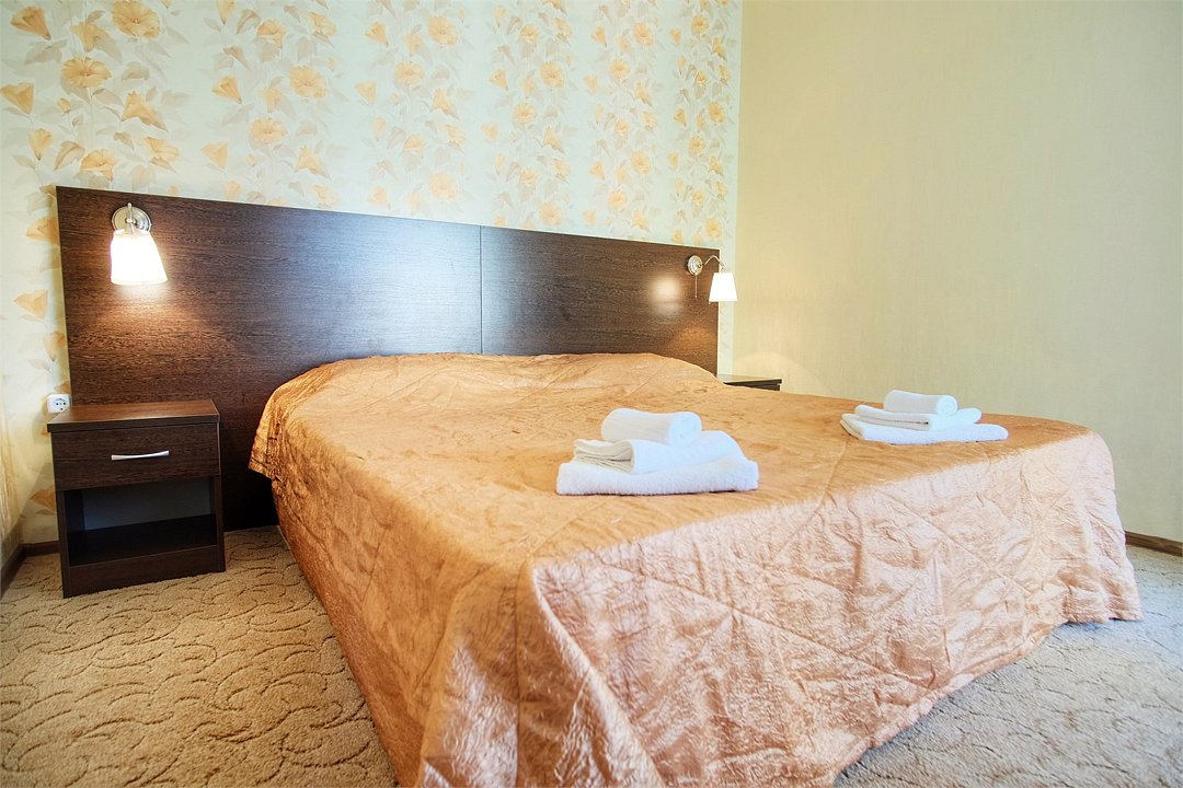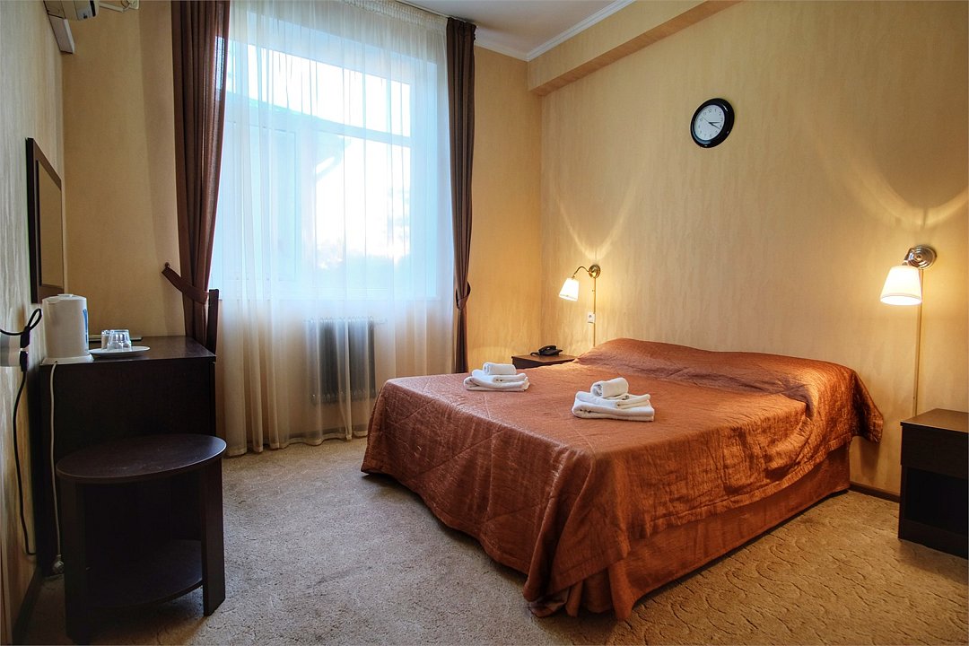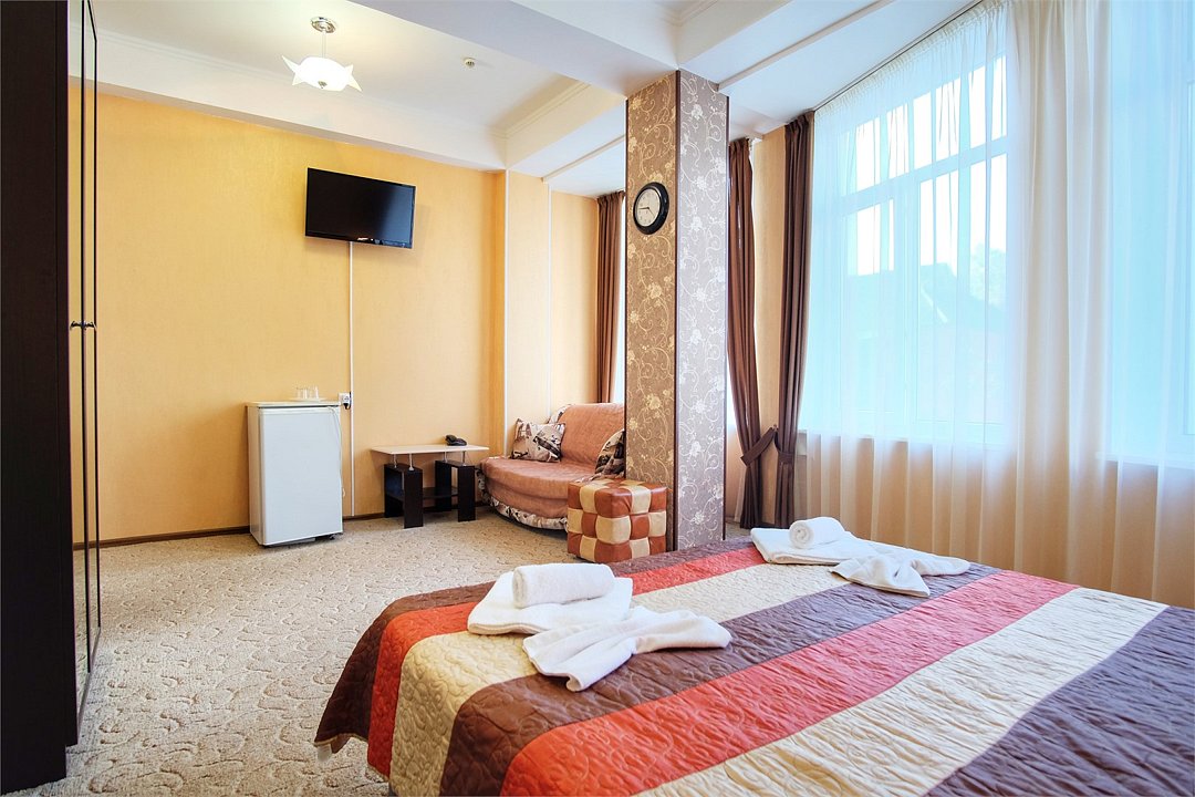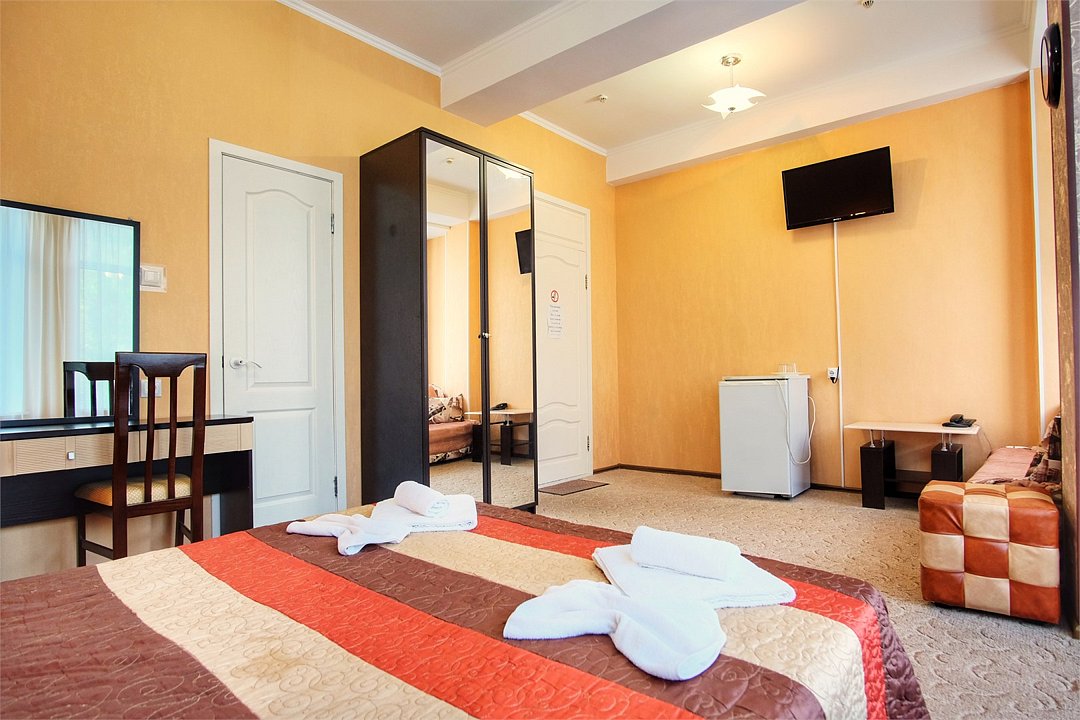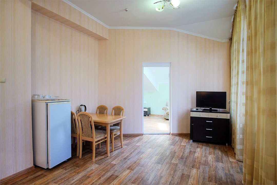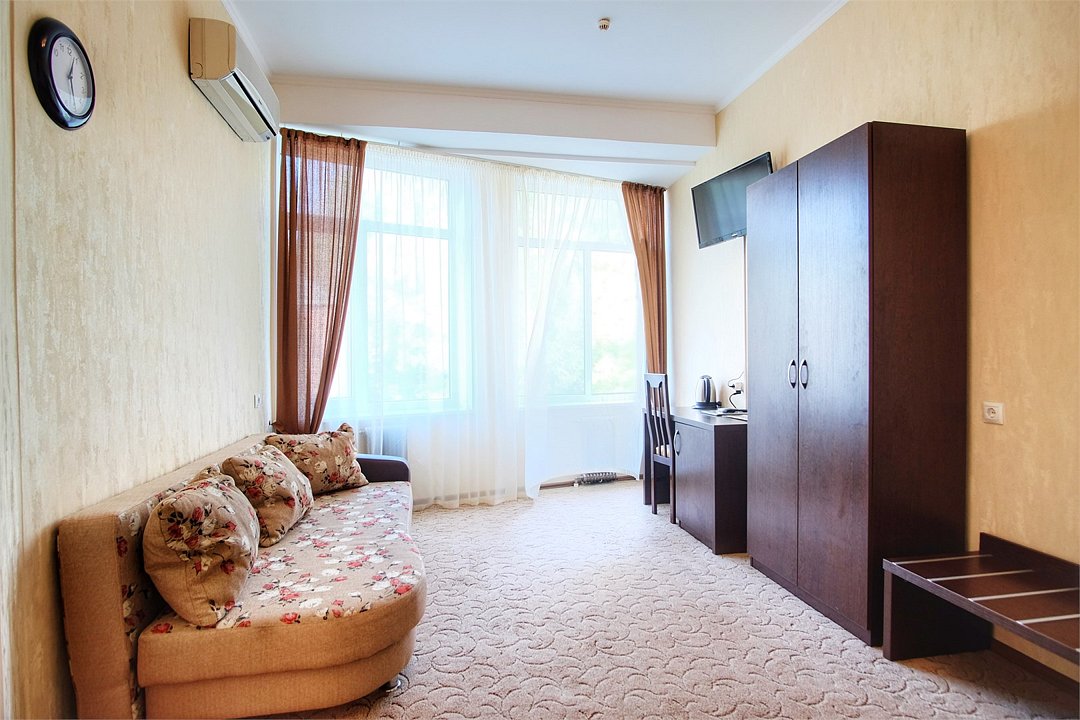 Однокомнатный просторный номер с совмещенной гостиной и спальней предназначен для проживания двух гостей, но имеется раскладной диван, который легко трансформируется в дополнительное место. Интерьер выдержан в спокойных пастельных тонах, в 2015 году установлена новая мебель.Услуги и удобства