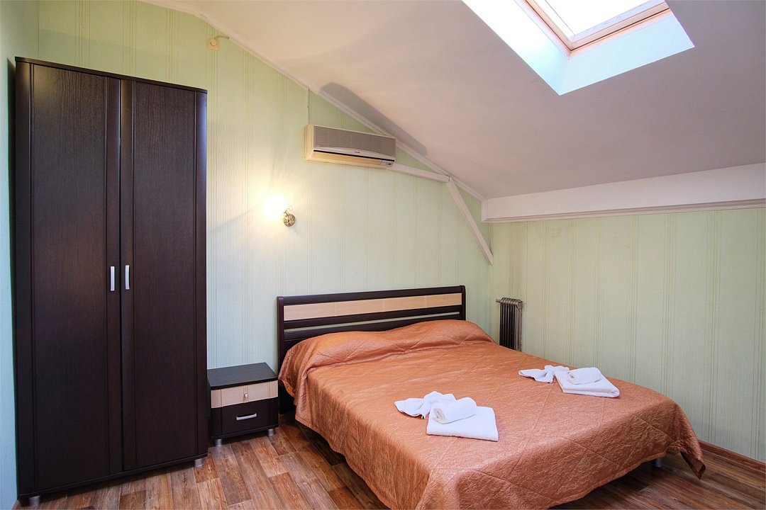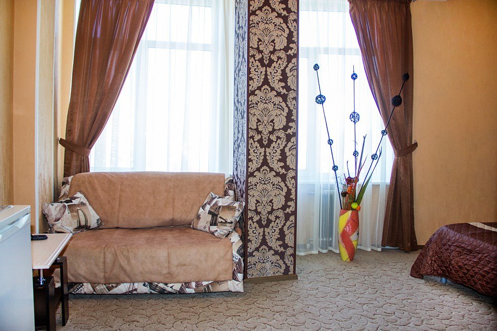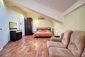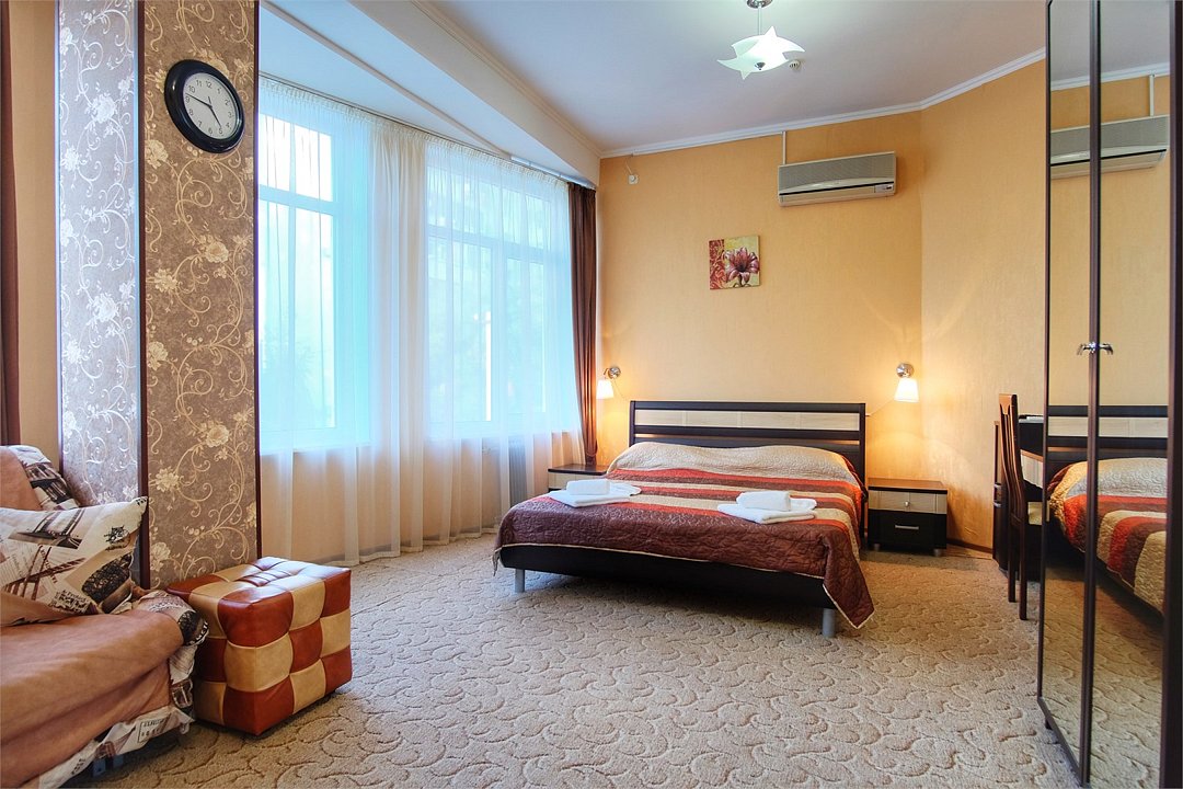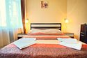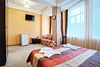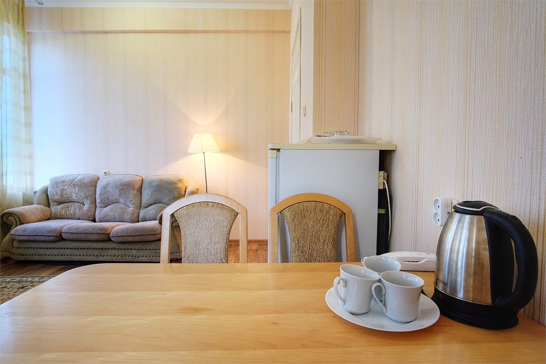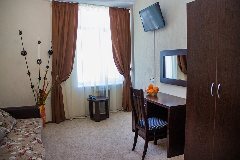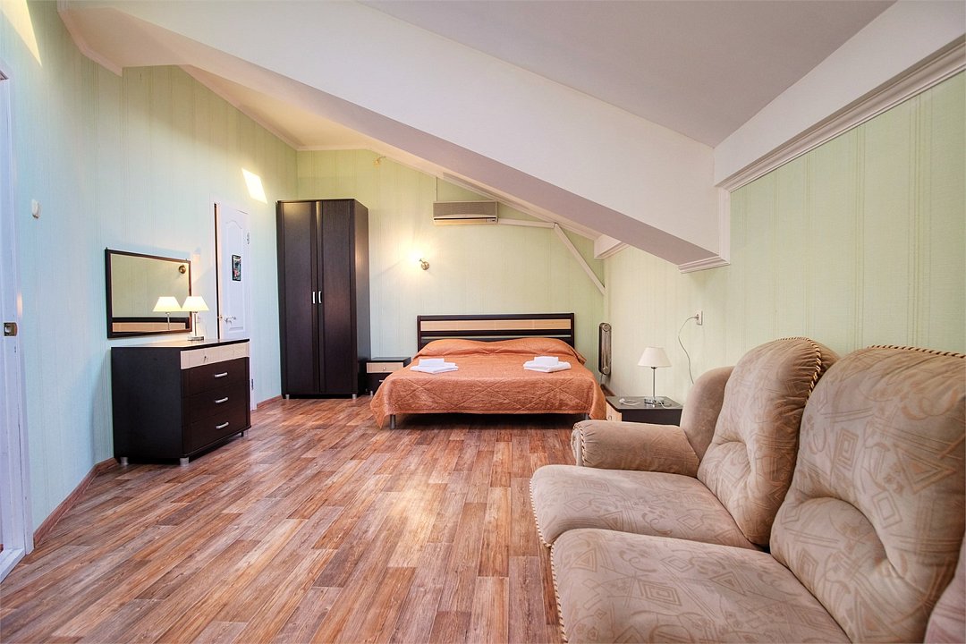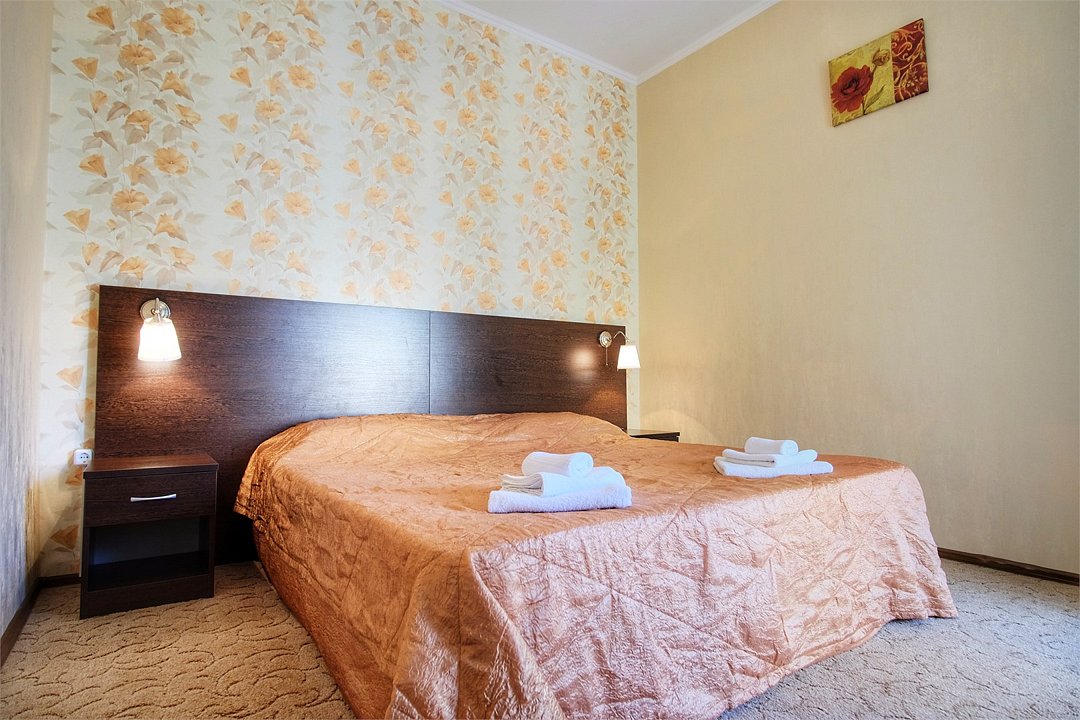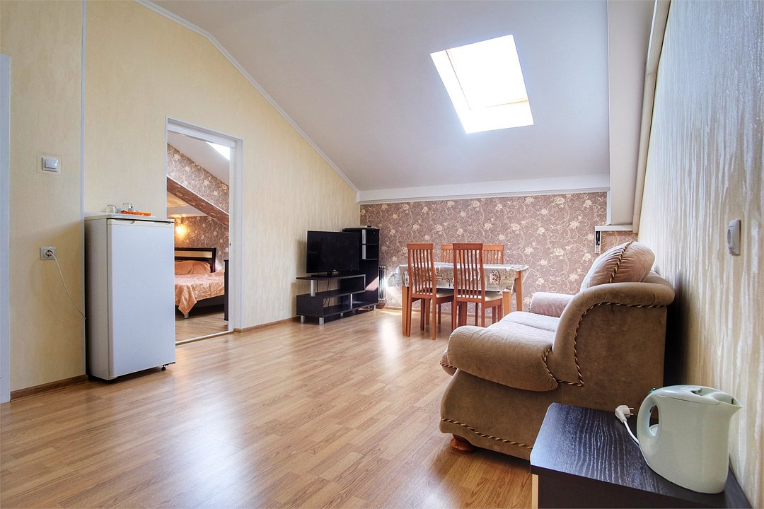 Однокомнатный просторный номер с совмещенной гостиной и спальней предназначен для проживания двух гостей, но имеется раскладной диван, который легко трансформируется в дополнительное место. Интерьер выдержан в спокойных пастельных тонах, в 2015 году установлена новая мебель.Услуги и удобства