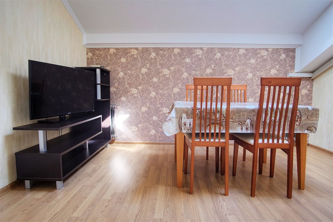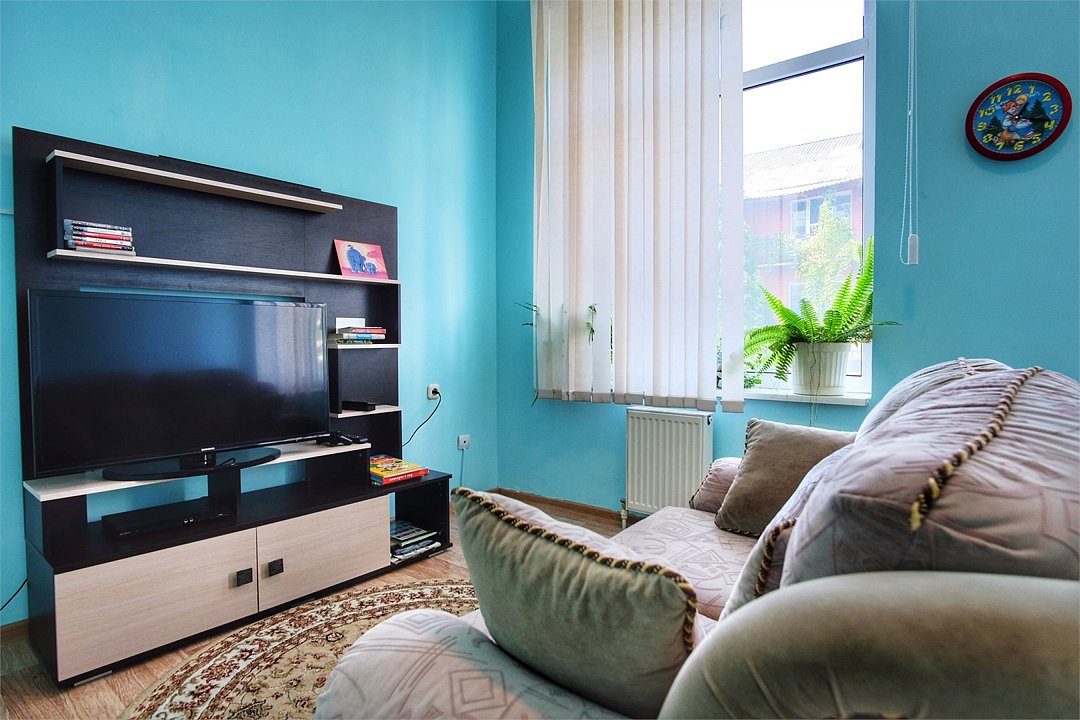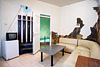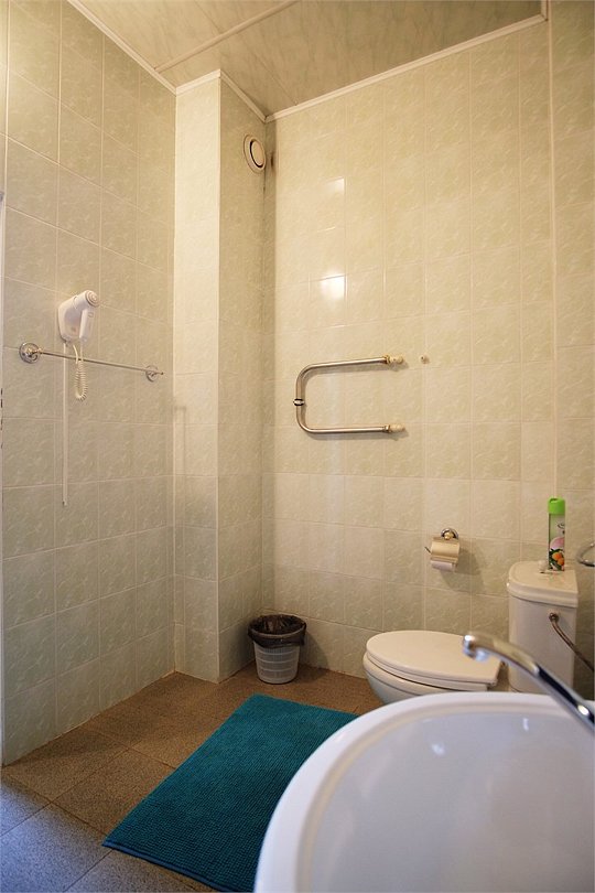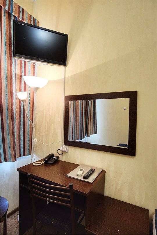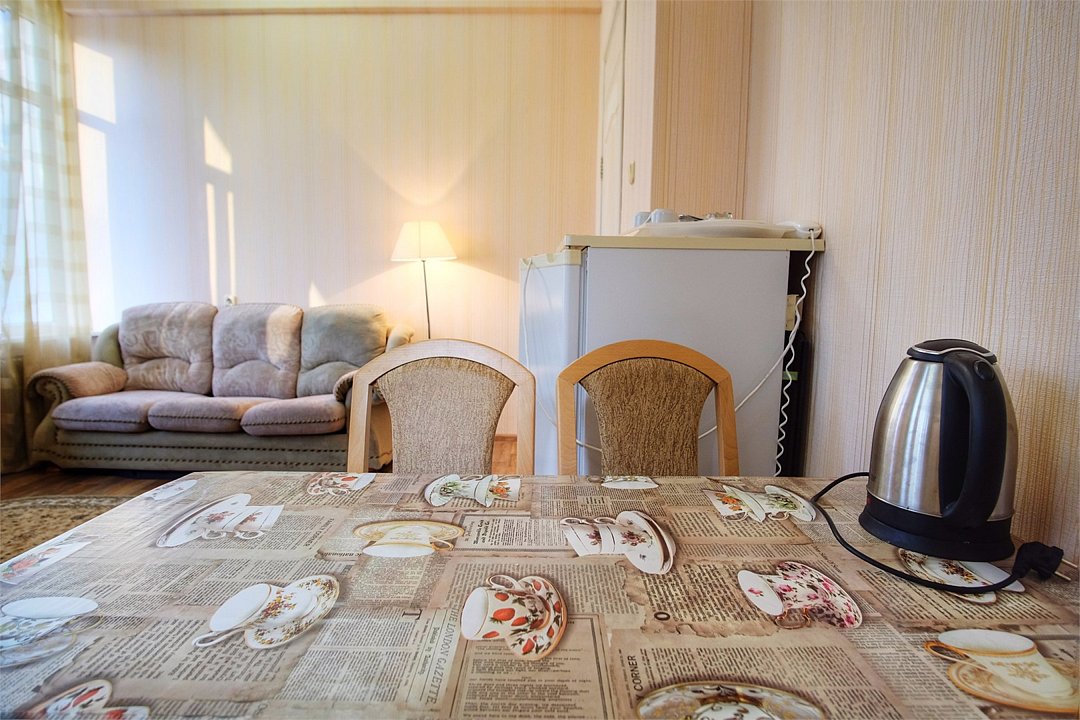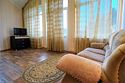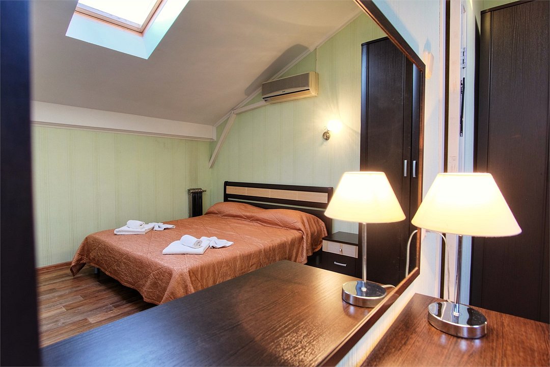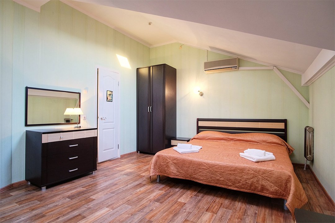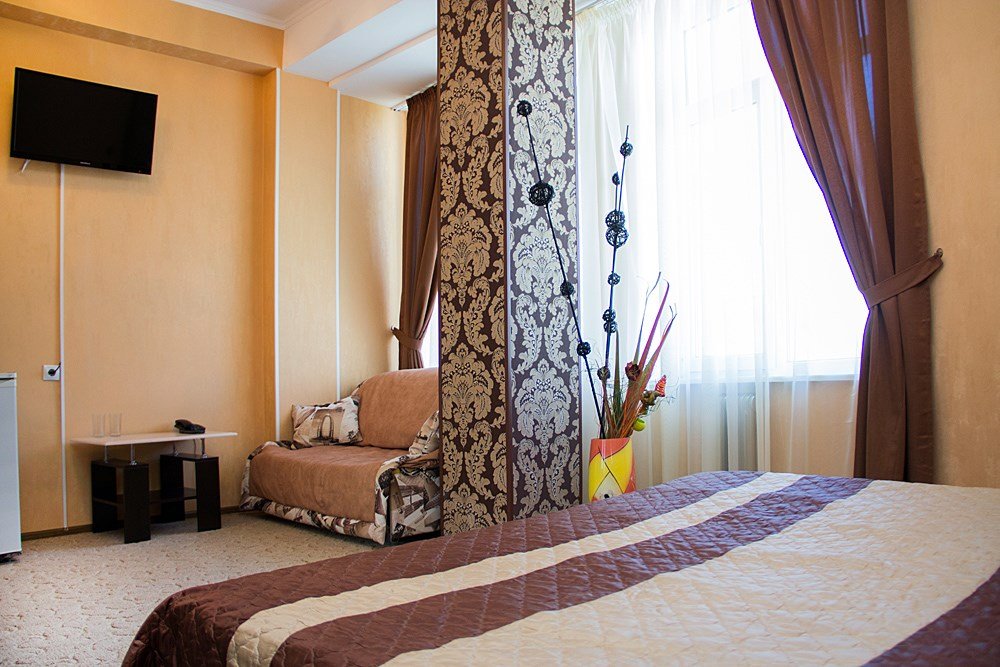 Однокомнатный просторный номер с совмещенной гостиной и спальней предназначен для проживания двух гостей, но имеется раскладной диван, который легко трансформируется в дополнительное место. Интерьер выдержан в спокойных пастельных тонах, в 2015 году установлена новая мебель.Услуги и удобства