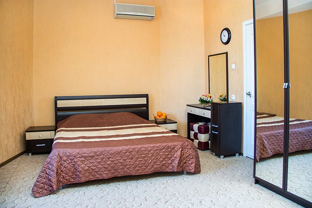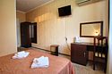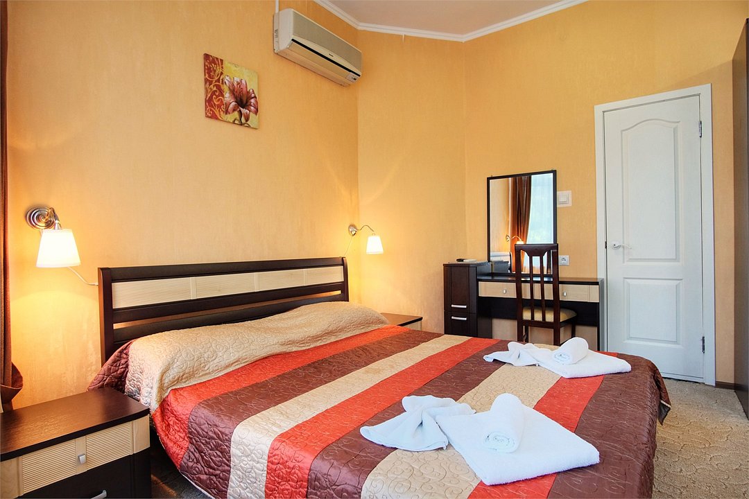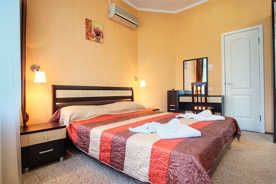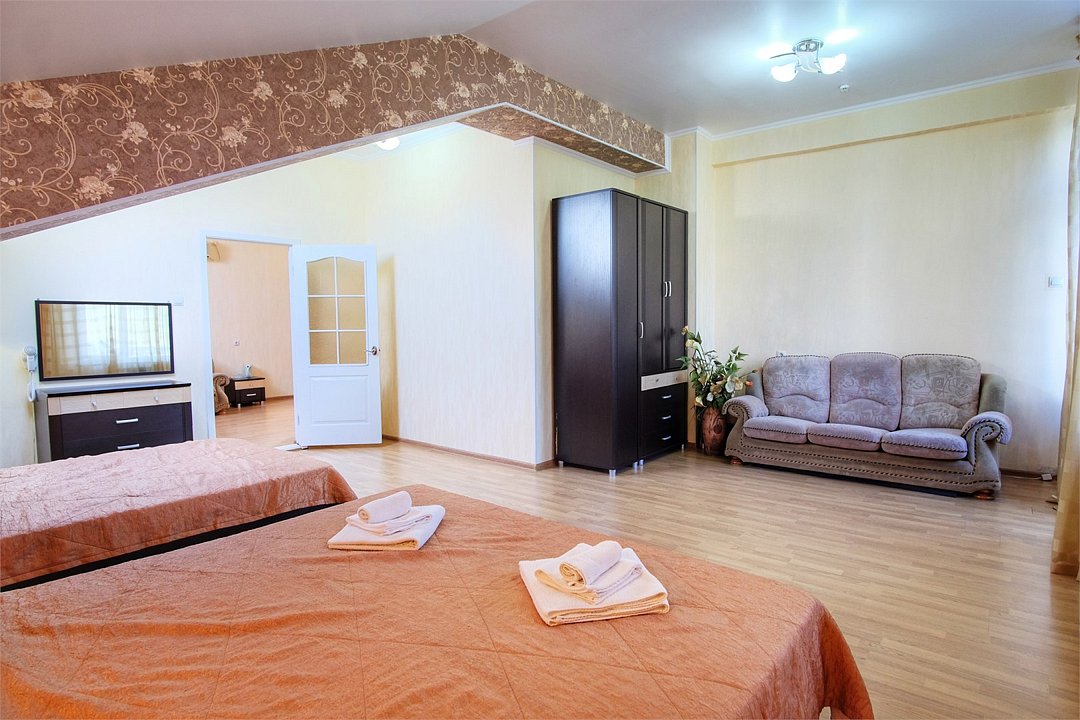Двухкомнатные большие номера с выходом на большую террасу хорошо подходят тем, кто приезжает в Анапу большой семьей или с детьми: диван может раскладываться и создавать дополнительное спальное место, в гостиной достаточно места, чтобы дети, не чувствуя скованности, могли играть. Светлые просторные номера в пастельных тонах оснащены хорошей мебелью. В спальне — две двухспальных кровати, большой шкаф, туалетный столик.Услуги и удобства