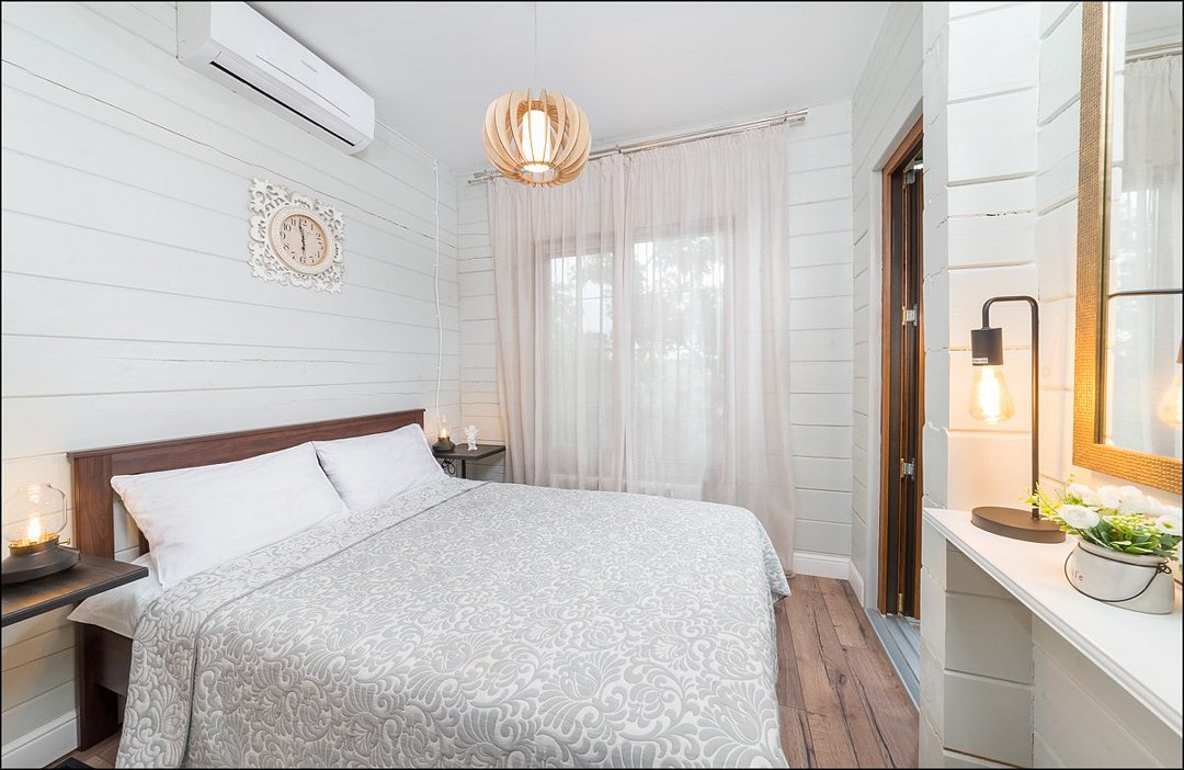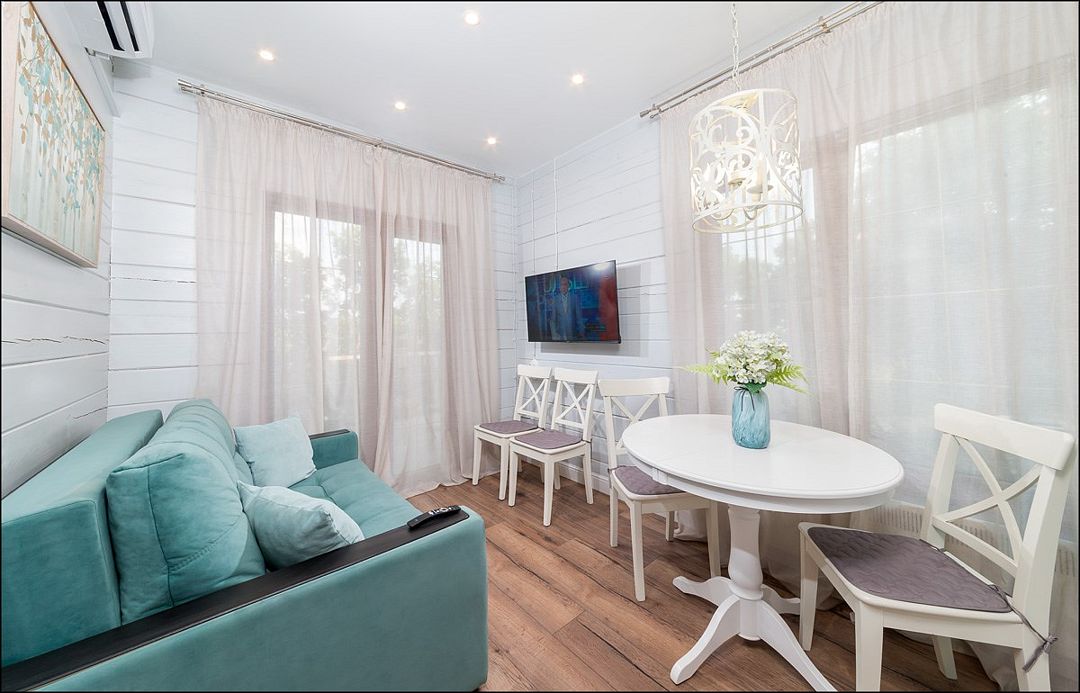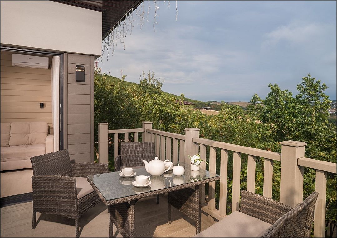 Четыре комфортабельных благоустроенных коттеджа категории LUXE в стиле «Прованс» (36 м²), с собственной террасой укомплектованной мягкой террасной мебелью для 4-х гостей, с панорамными окнами и потрясающими видами на дубраву, море и горы Рассчитан на комфортное проживание 4-х гостей (размещение: 2+2) - Уютная изолированная спальня с двуспальной кроватью и выходом на террасу - Общая гостинная с обеденной зоной и зоной кухни и выходом на террасу Комплектация кухни: - электрическая (индукционная) плита - микроволновая печь - чайник - холодильник - столовые приборы, посуда для приготовления и употребления еды - двухместный раскладной диван -Кондиционер, Телевизор, конвекторы для обогрева, Интернет, бойлер - санузел с душевой кабиной, феном, набором отельной косметики серии LUXE и наборами белоснежных махровых полотенец, тапочек и халатов - питьевая, очищенная родниковая вода.