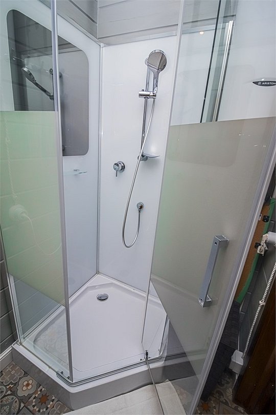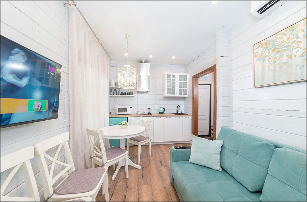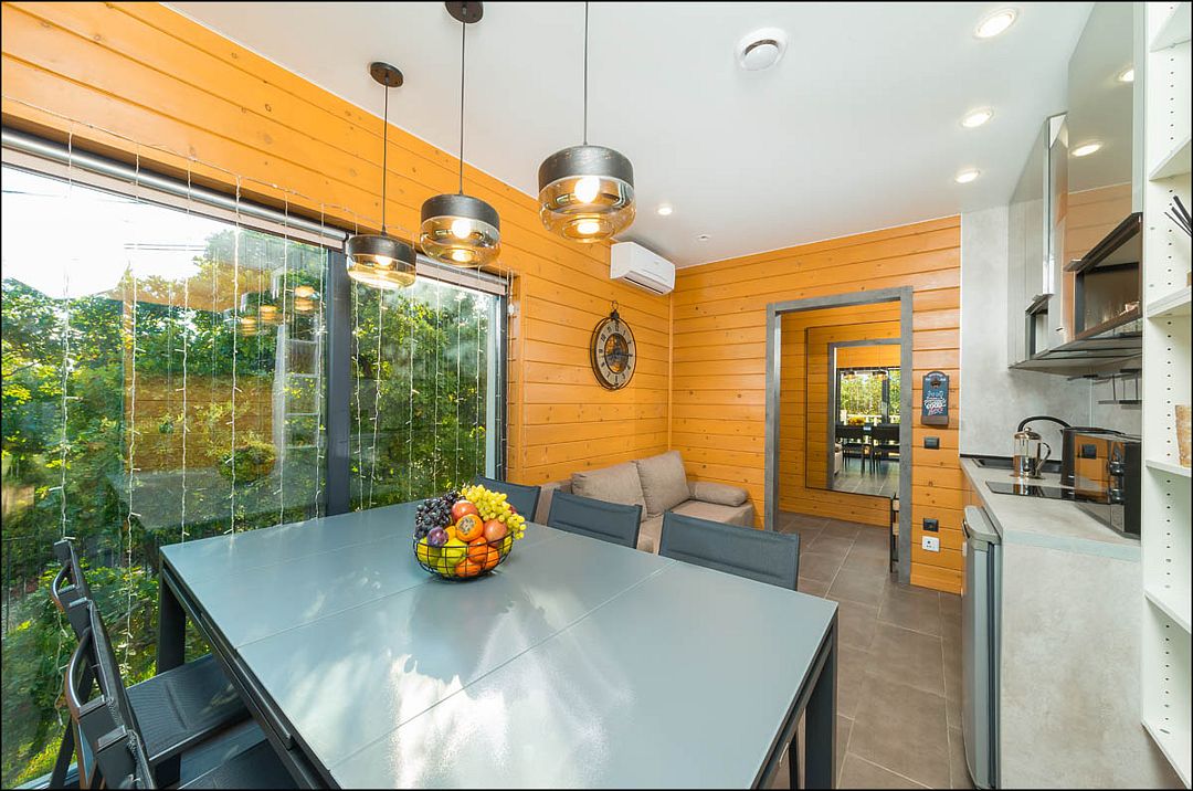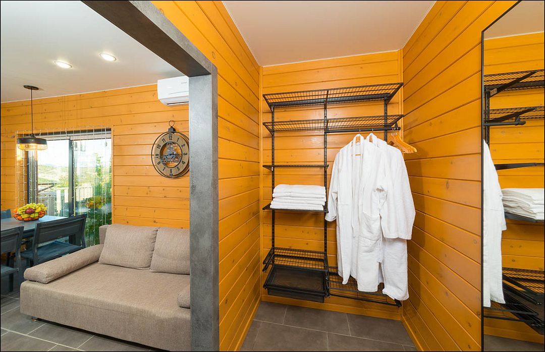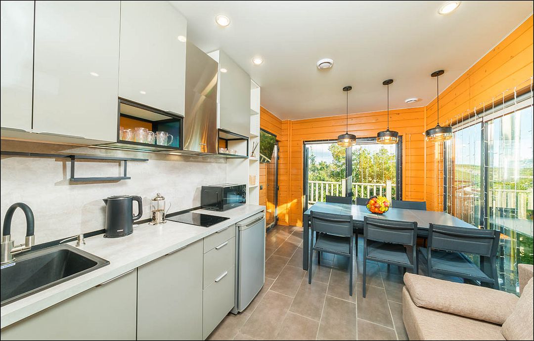 Гости могут расположиться на раскладываемом диване или за большим обеденным столом. Изюминкой является балкон-терраса с банным чаном, наполненным подогреваемой водой, где можно наслаждаться водными процедурами под звездами или наблюдать закат. В бане есть душ, туалет, набор банных принадлежностей, а для контрастных процедур доступно обливное устройство «тропический ливень».