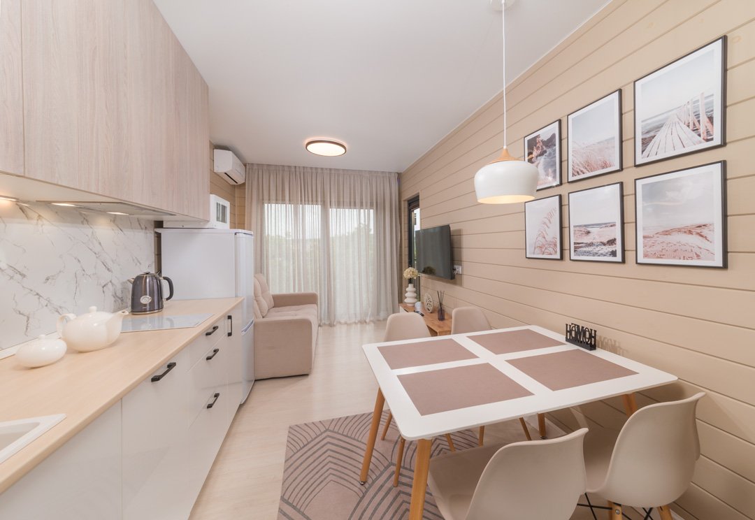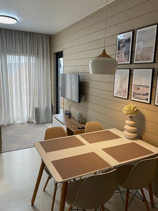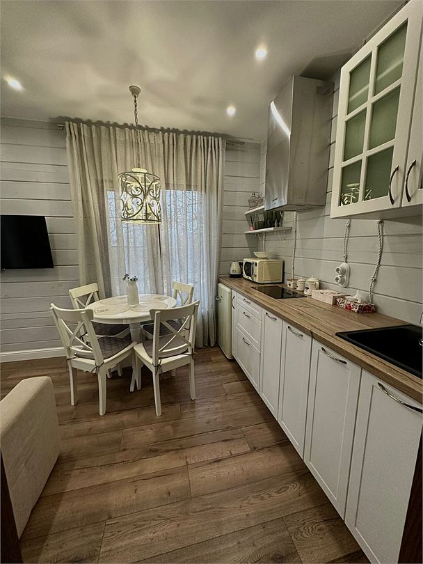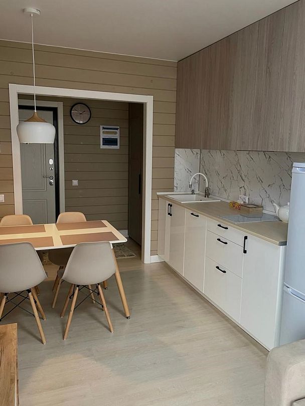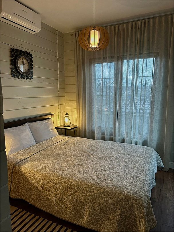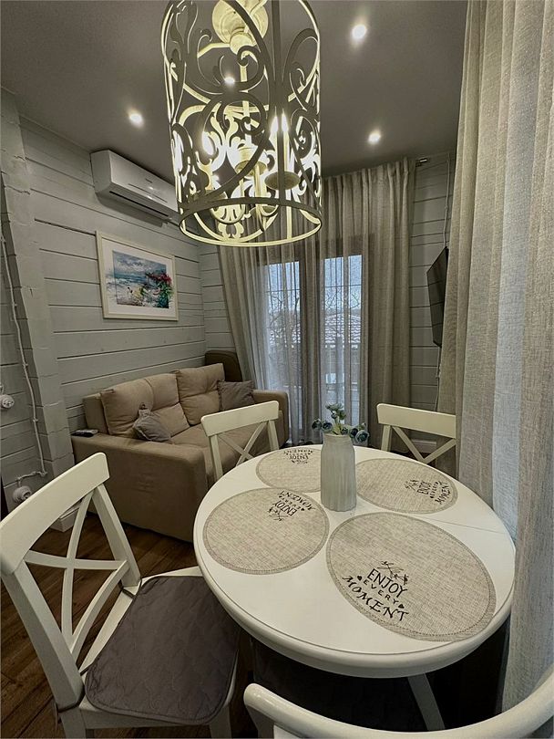 Семейный отдыхДостоинстваЧистая и ухоженная территория, аккуратная. Каменные дорожки, газон и молодые дубы. Чистый воздух и шикарная природа. Домик в стиле Икеи, смотрится весьма необычно и привлекательно. На кухне есть посуда и вся необходимая мебель, в общем, комфорт высочайшего уровня. В шкафу при необходимости можно взять дополнительное одеяло или плед. На территории имеется бассейн и зона, где можно пожарить шашлыки. Допускается посещение с животными (за доплату).