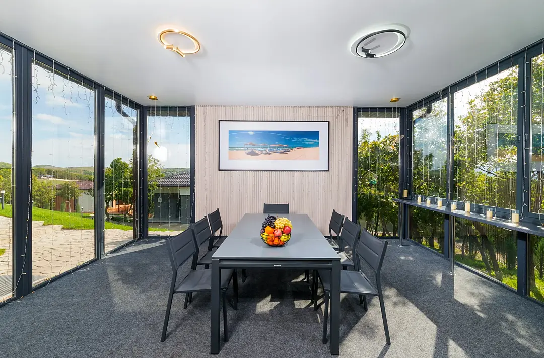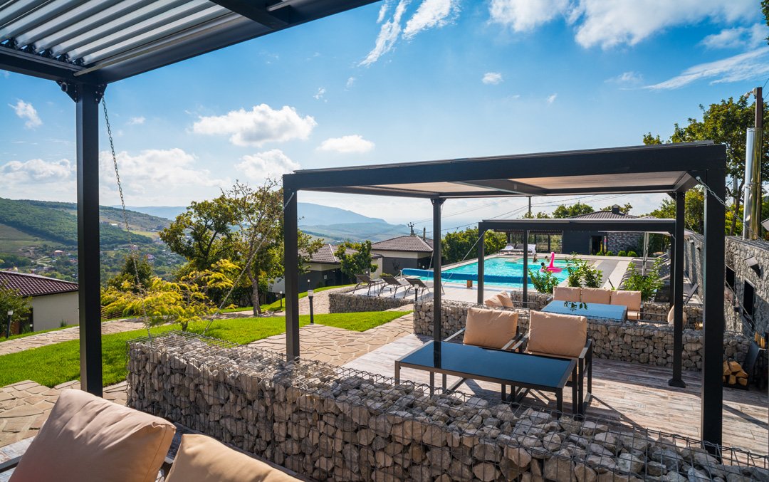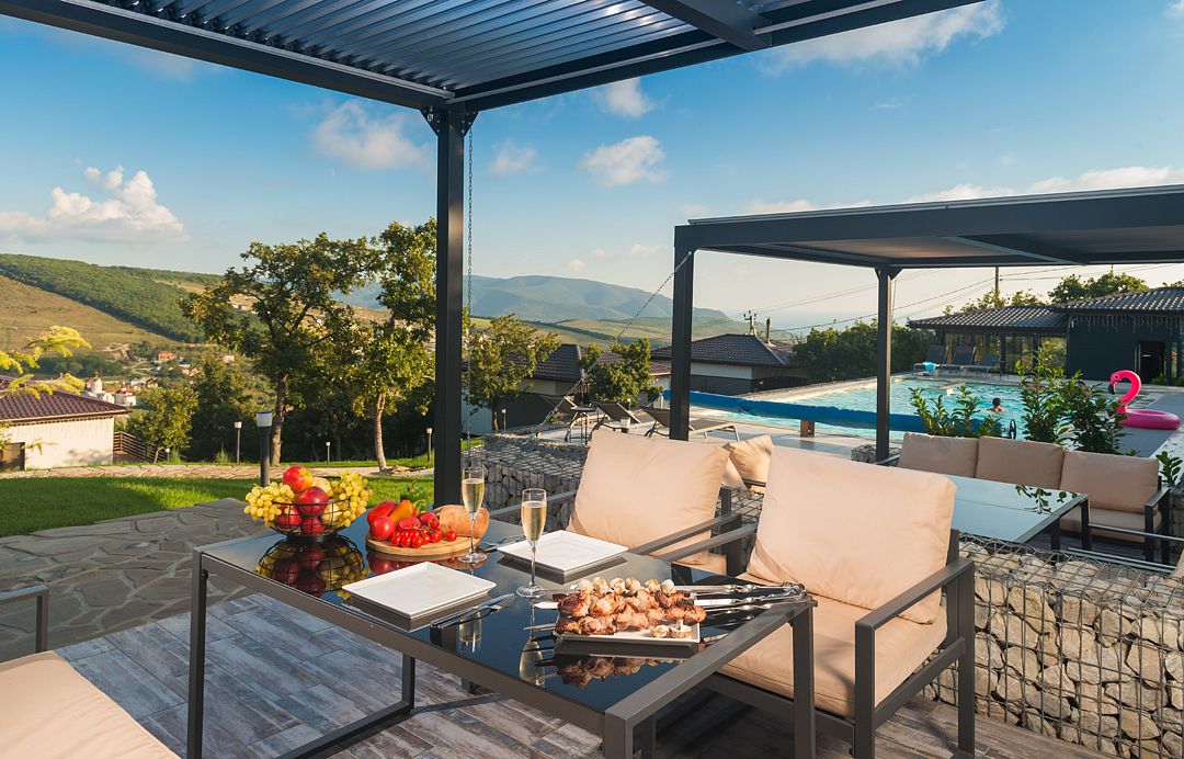 Витражная веранда идеально подходит для мероприятий до двадцати пяти человек. Это современное пространство с панорамными окнами, которые наполняют зал светом и открывают красивые виды на предгорья Кавказа.