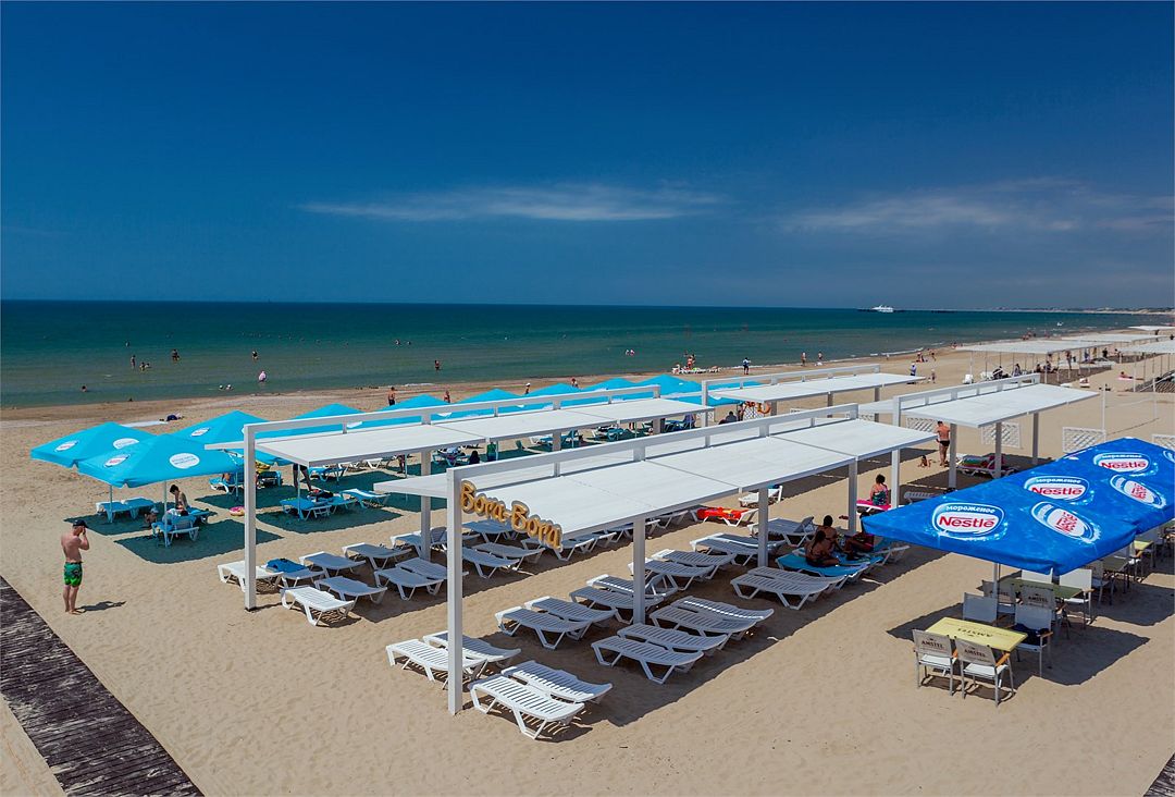 Инфраструктура: лежаки, зонтики, шезлонгиПесчаный пляж