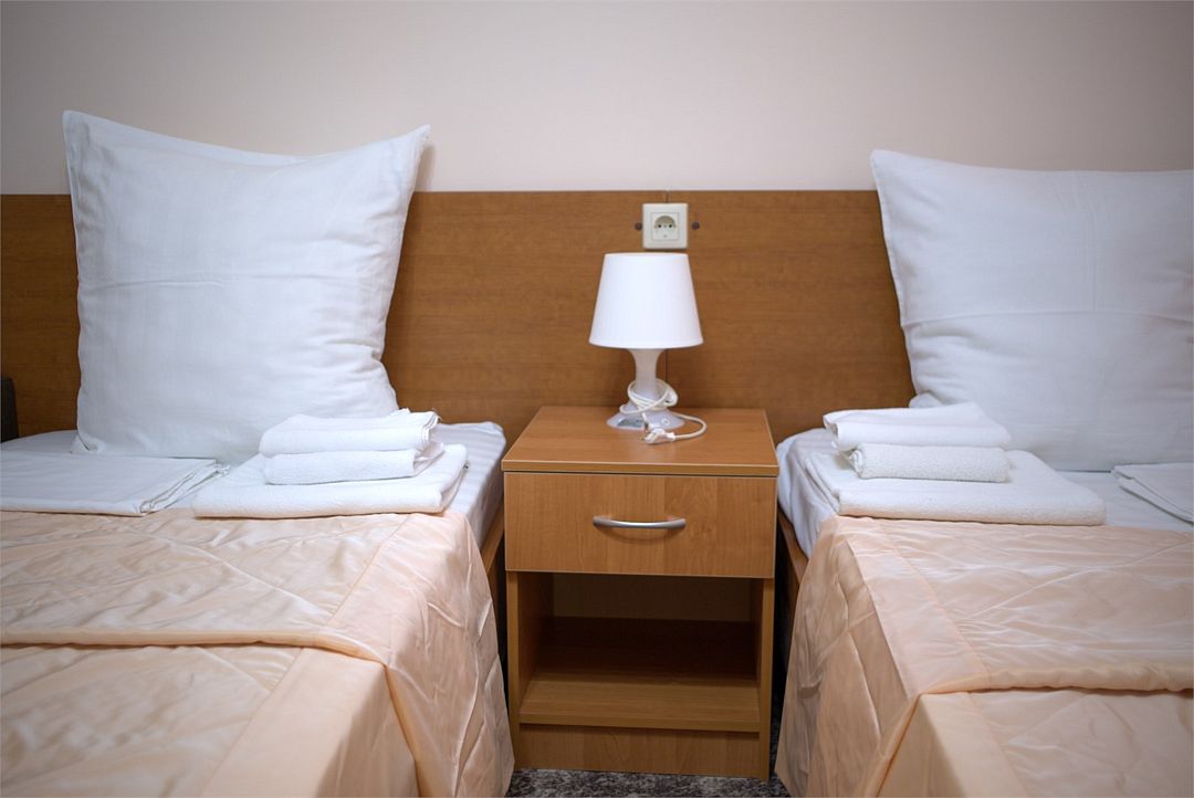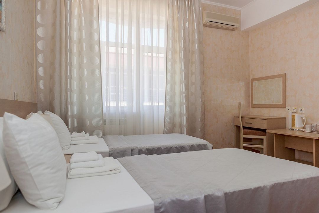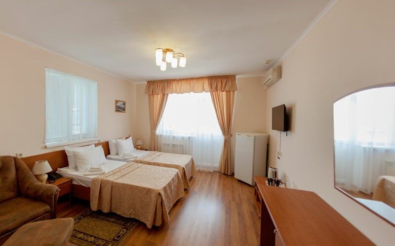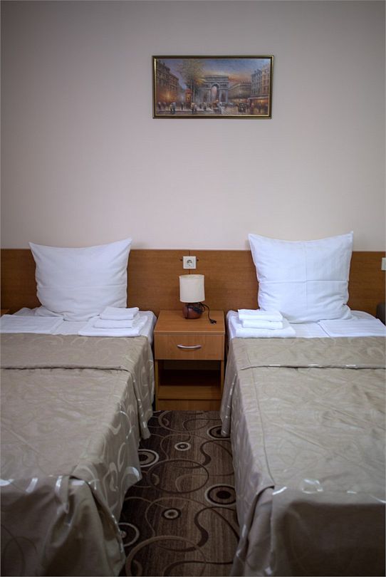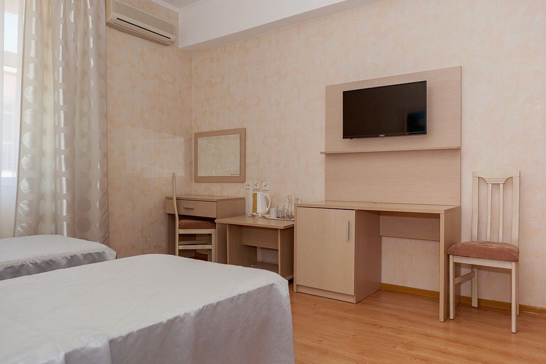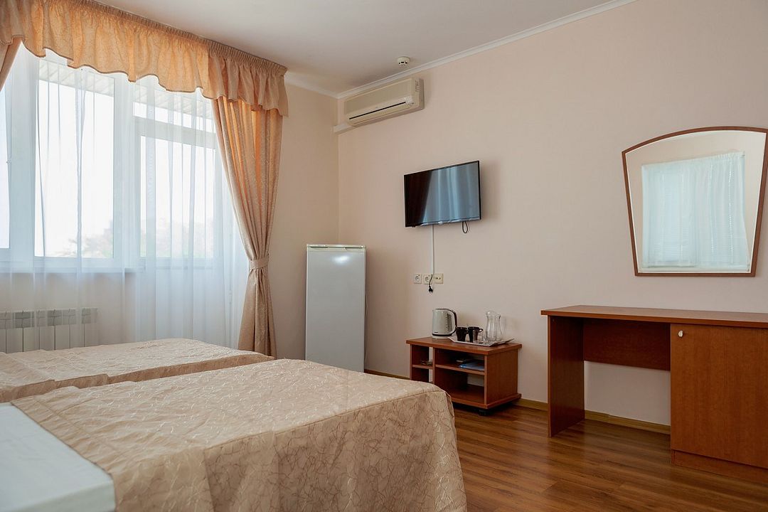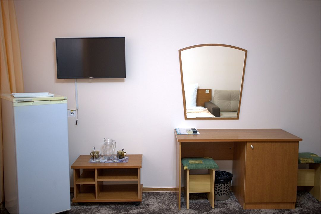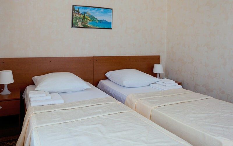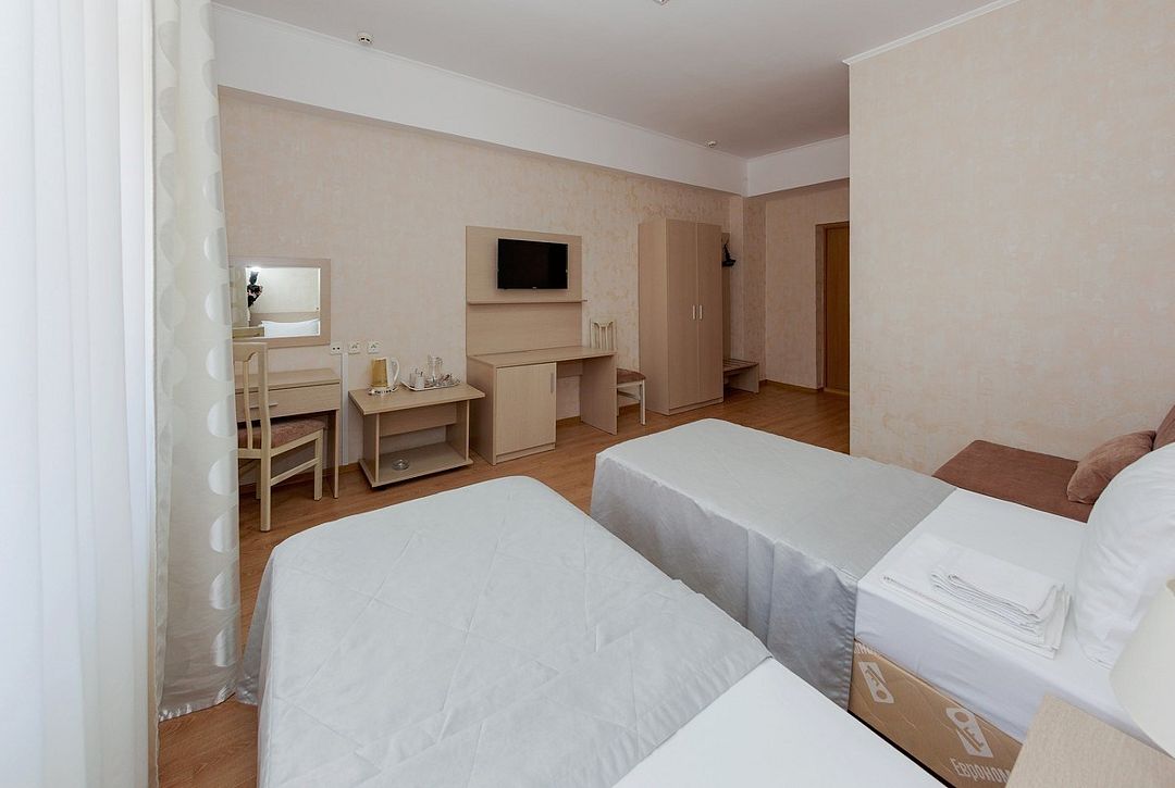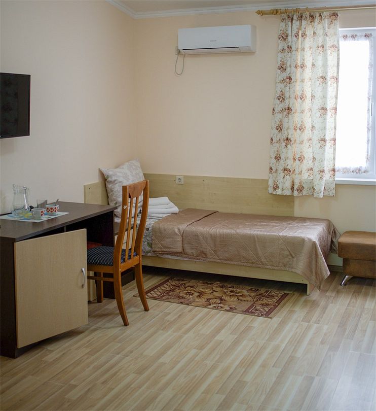 Комфортный однокомнатный эконом номер без балкона с возможностью размещения до 2 человек. Номера расположены в 5 корпусе на 2 и 3 этажах. Оптимально для отдыха одного взрослого с размещением 1 ребенка на дополнительном месте до 12 лет. Комплектация номера: две односпальные кровати, сплит-система, холодильник, телевизор, телефон. Санузел: душевая кабина, косметические принадлежности, фен.Услуги и удобства