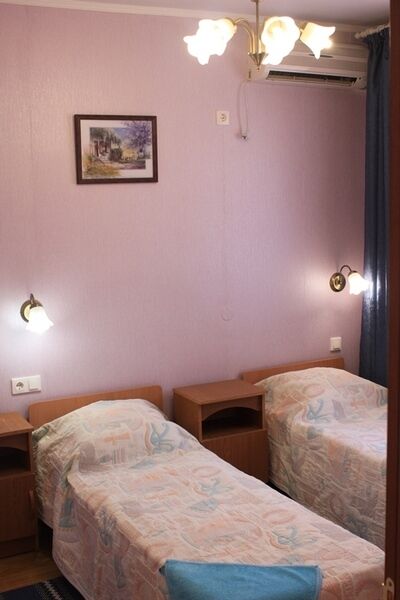 Односпальные или двуспальная кровати, шкаф, стулья, прикроватные тумбочки, журнальный столик, зеркало, кондиционер, холодильник, телевизор. Санузел в номере.