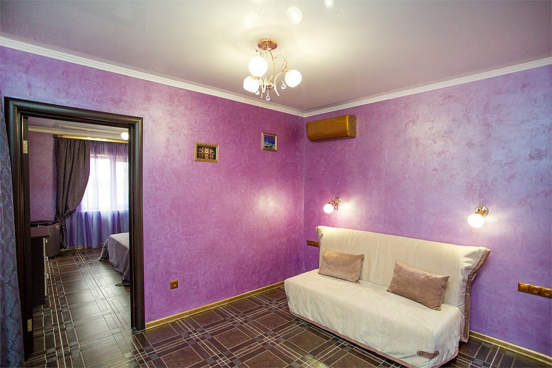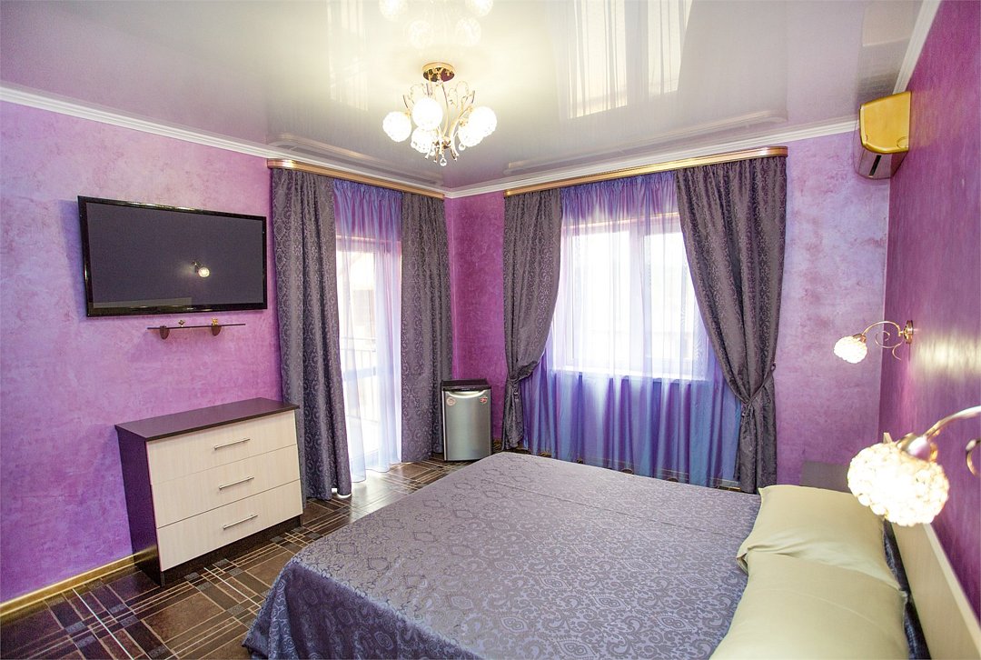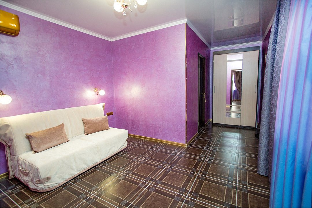 Номер с балконом на 2 этаже состоит из двух комнат и собственного санузла. Количество мест – до 4 (в спальне 2-х спальная кровать, в гостиной – раскладной 2-х местный диван). В номере москитная сетка, балкон с красивым видом, сплит-система, шкаф для одежды, чайник и набор посуды, ванная комната оборудована душем, унитазом, есть раковина с зеркалом, полотенцесушитель, фен, туалетные принадлежности (гель для душа, шампунь и мыло),Услуги и удобства