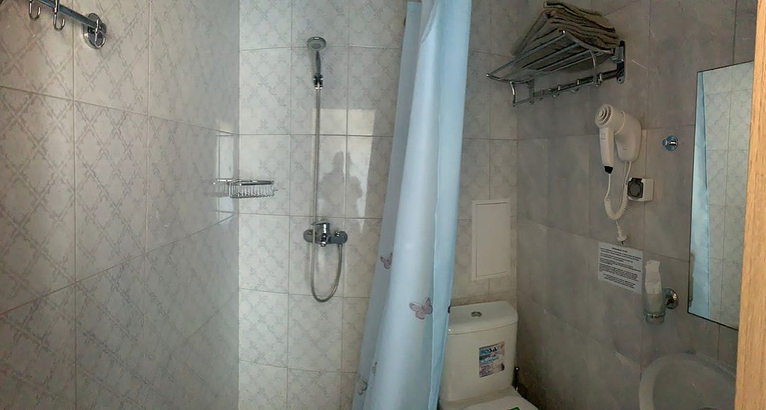Wi-Fi, интернет, кондиционер, фен, тапочки, двуспальная кровать, шкаф для одежды, вешалки, журнальный столик, унитаз, раковина, душ, кулер на этаже, вид во двор, тумба, туалетные средства, туалет, мини-холодильник, вид на горыВ номере