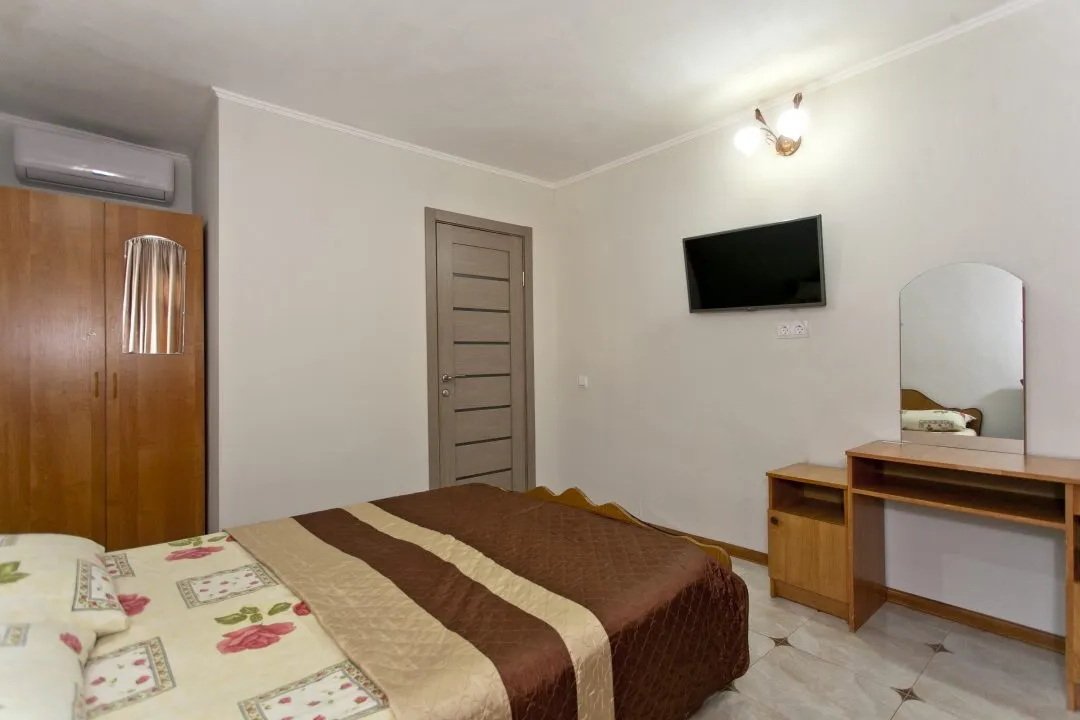 Двухспальная кровать 1.40 м, шкаф, зеркало, прикроватная тумбочка, телевизор, кондиционер, мини-холодильник.