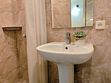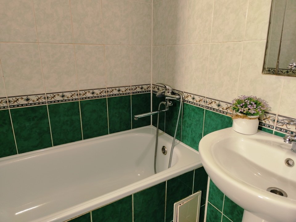Ванная комната: ванна, унитаз, раковина, туалетные принадлежности.