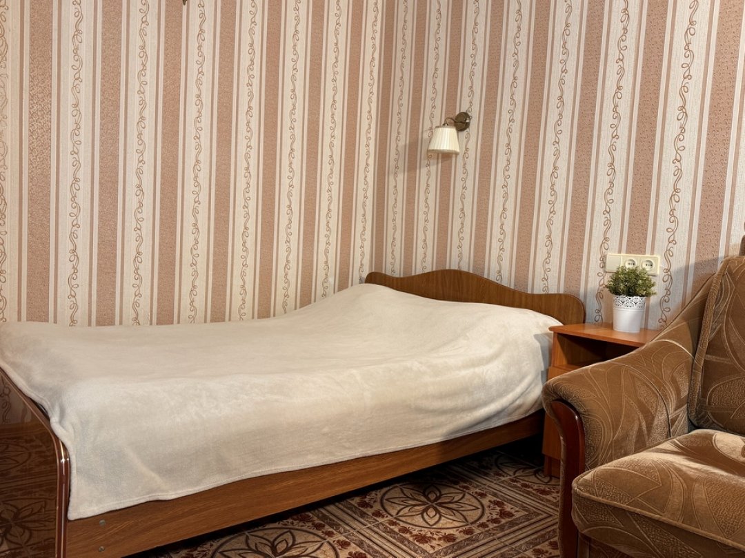 Двухспальная кровать 1.40 м или две кровати 80 см, шкаф, трюмо, зеркало, прикроватная тумбочка, телевизор, кондиционер, мини-холодильник.
