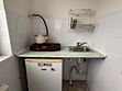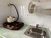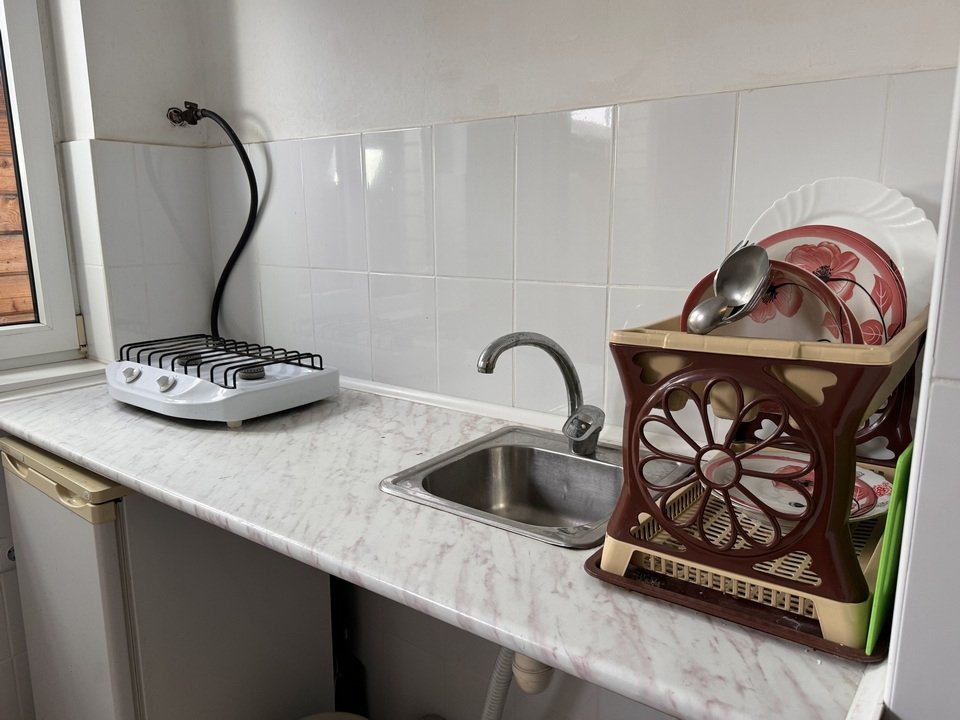 Мини-кухня: плита, мини-холодильник, раковина, чайник.