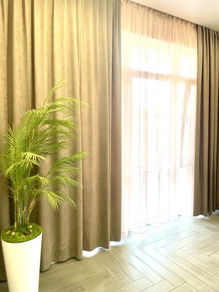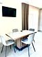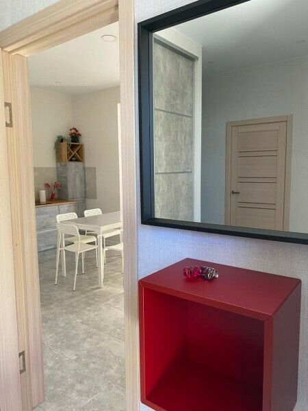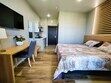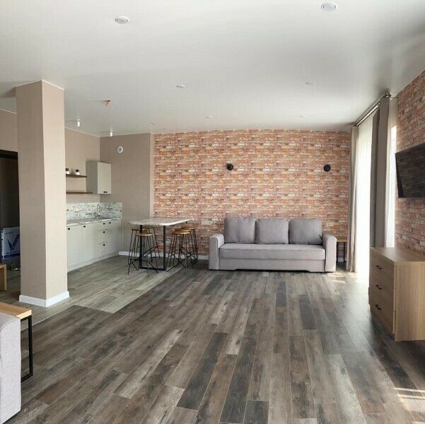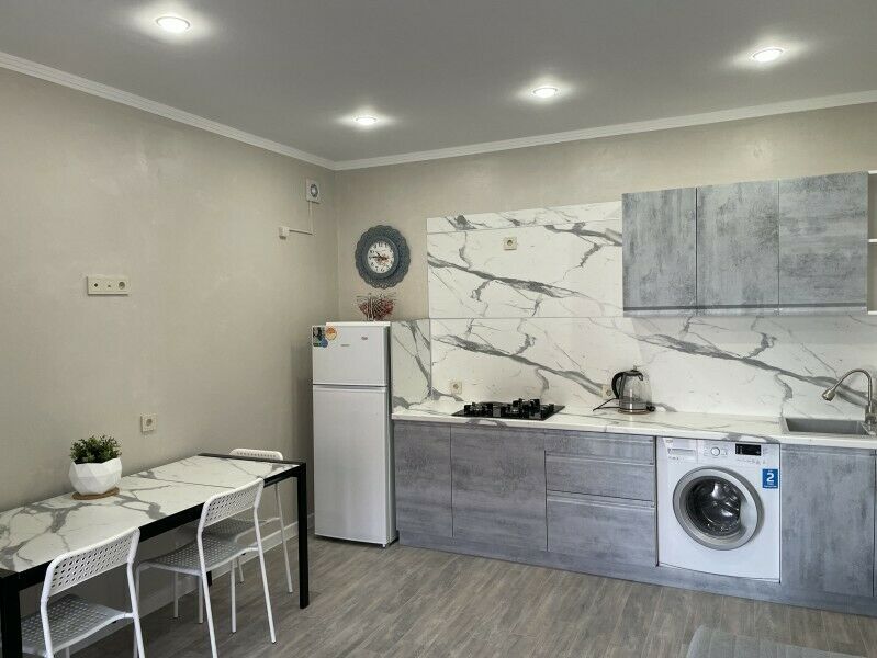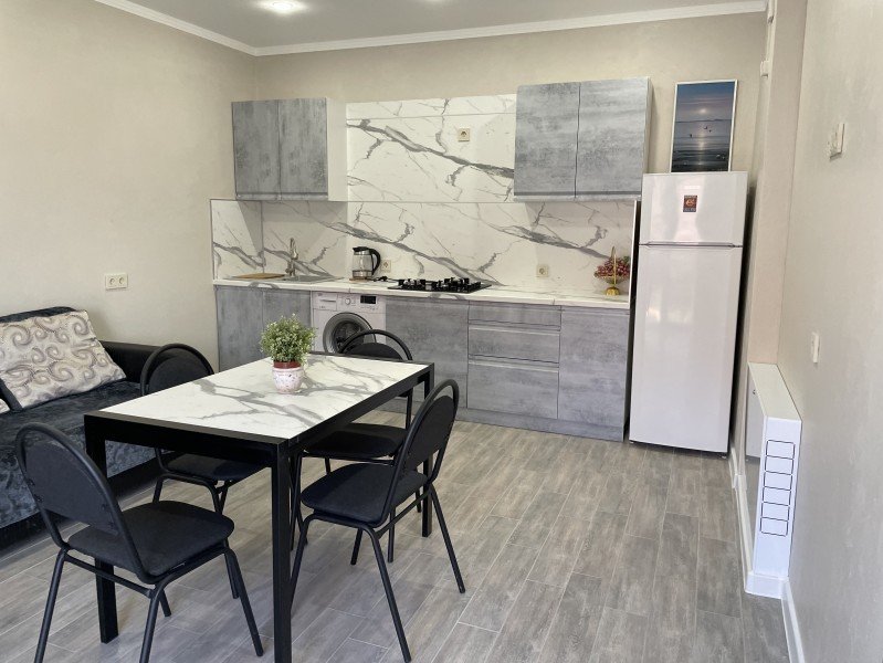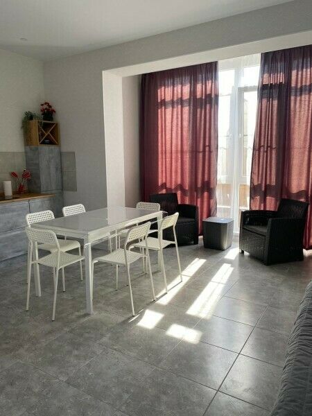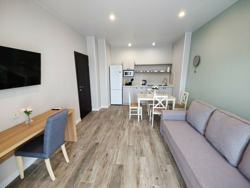 В комнате: двухместный и трехместный диваны с ортопедическим основанием (для комфортного ежедневного сна). Сплит система, мини-кухня (на кухне: электрочайник, холодильник, микроволновая печь, встроенная стекло-керамическая плита, набор посуды). Обеденный стол. Шкаф. Плазменный телевизор СМАРТ TV/ Wi-Fi. Панорамное остекление. Высокие потолки.