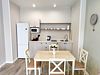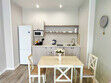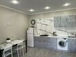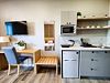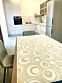 Кухня: электрочайник, встроенная стекло-керамическая плита, большой холодильник, микроволновая печь, набор посуды, обеденный стол.