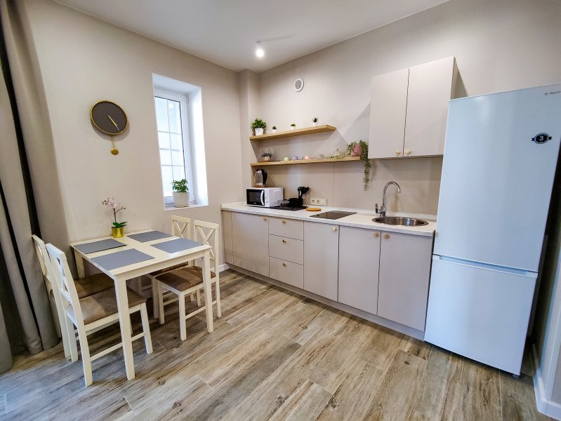 В комнате: двуспальная кровать шириной 1,80х2,0 м с ортопедическим матрасом, спилит система. Мини-кухня (на кухне: электрочайник, холодильник, микроволновая печь, набор посуды), шкаф для одежды, прикроватные столики, плазменный телевизор, CMAPТ-TV,бесплатный Wi-Fi.