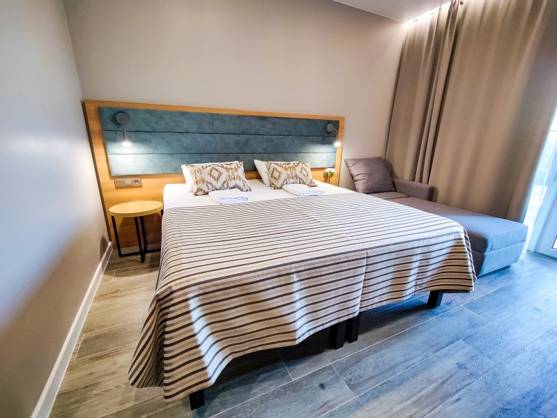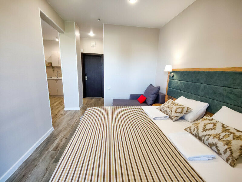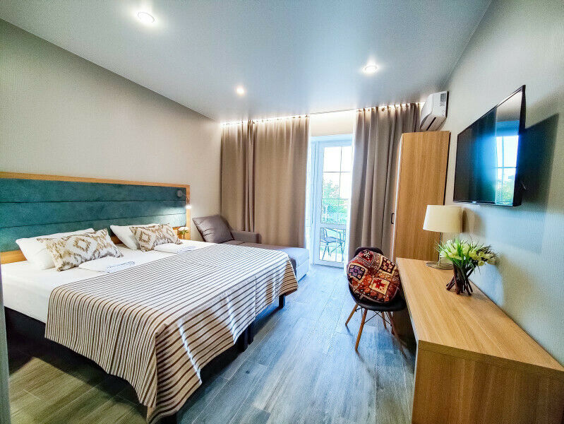 В комнате есть возможность установить два дополнительных места, детская кроватка (по запросу). В ванной комнате: современная сантехника, душевая кабина, туалетные принадлежности, махровые полотенца, фен. Уличная мебель на балконе. Сушилка для белья. В комплексе есть прачечная и место для глажки белья.