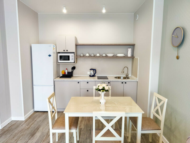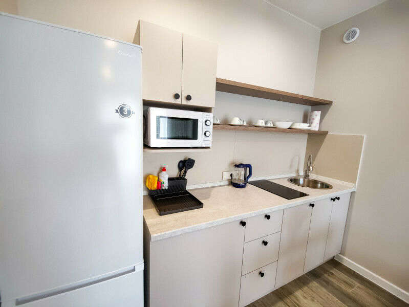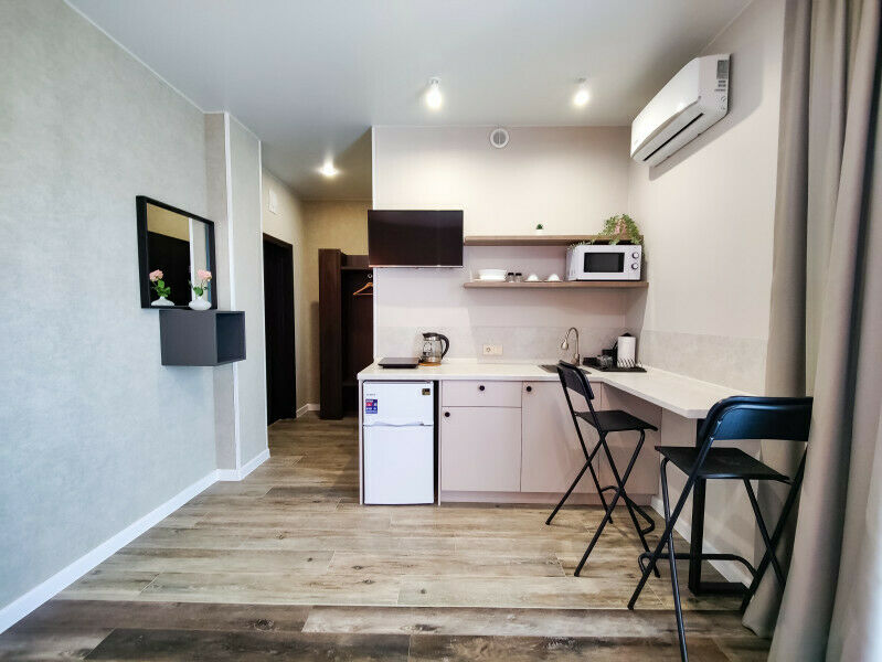 Мини-кухня (на кухне: электрочайник, холодильник, микроволновая печь, набор посуды).