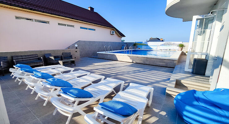 На территории обустроена мангальная зона, есть детская площадка. В сезон организуется рыбалка, во дворе работает подогреваемый бассейн на случай, если вам не захочется идти на пляж. Также здесь есть зал для проведения конференций или праздничных мероприятий.