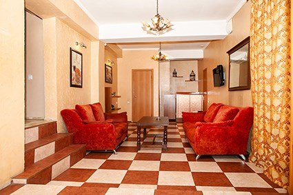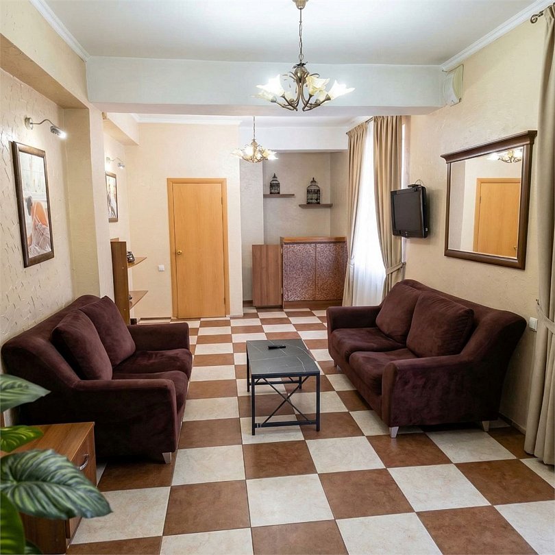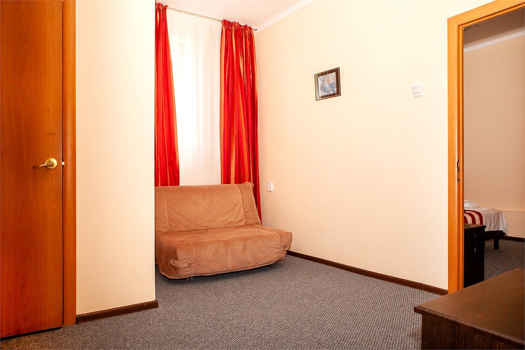мягкая мебель, телевизор, холодильник, душ, туалет, кондиционер, телефон, 25 кв.м., ( дополнительным местом является еврораскладушка и диван), комнаты разделены дверью, без балкона, высокий этаж.Услуги и удобства