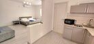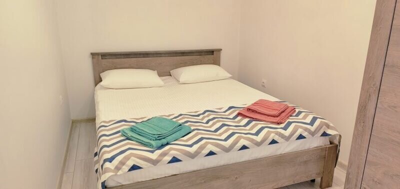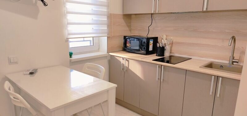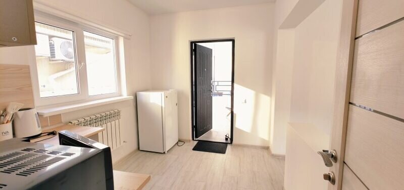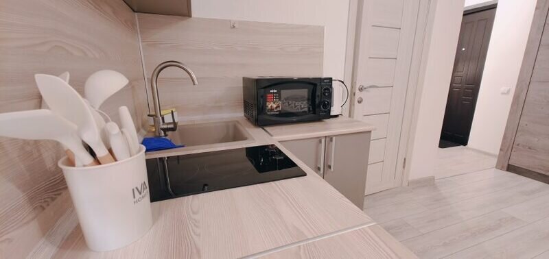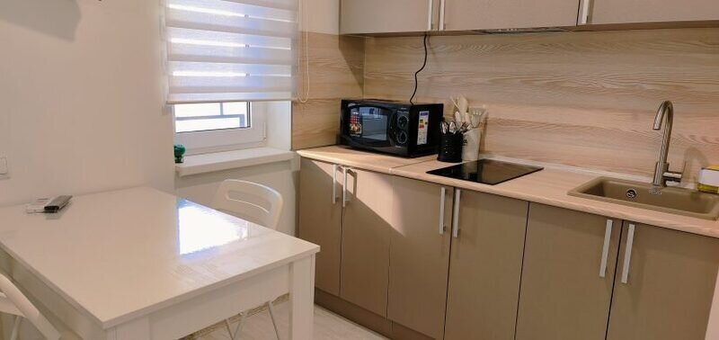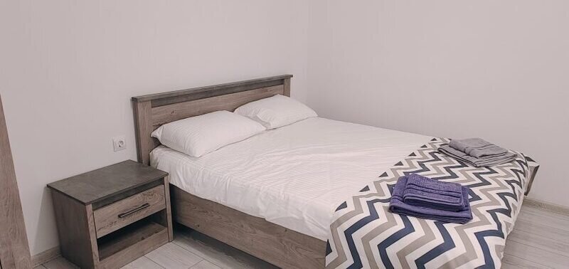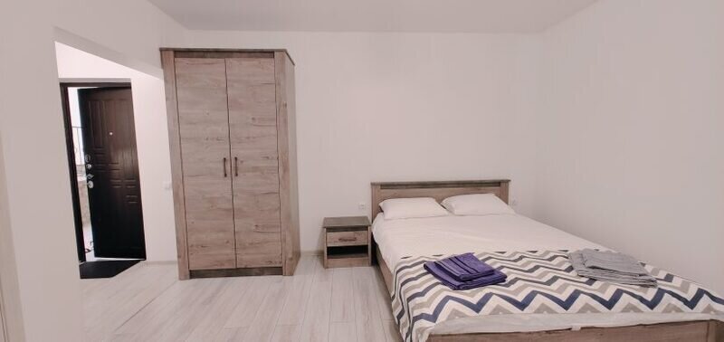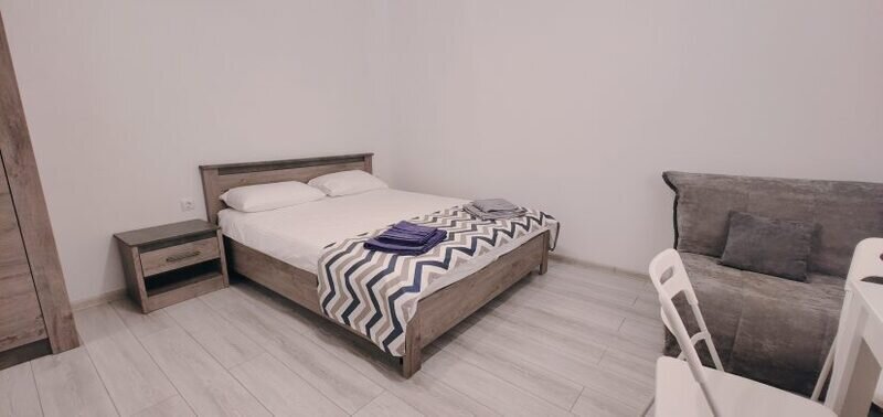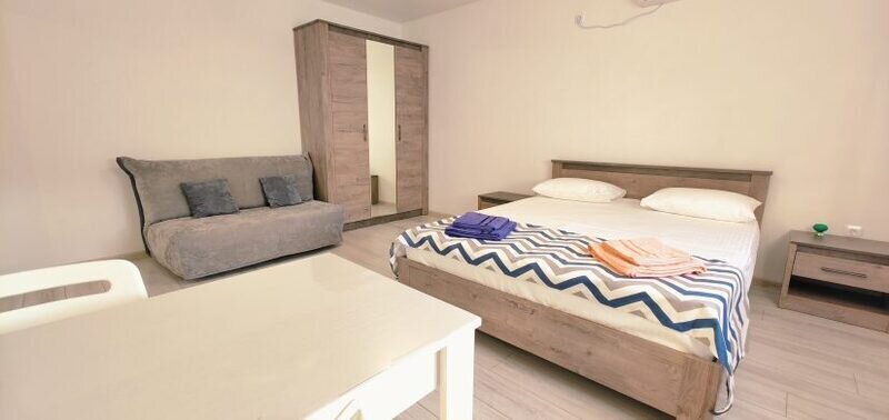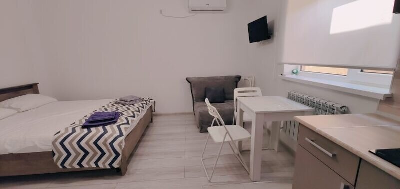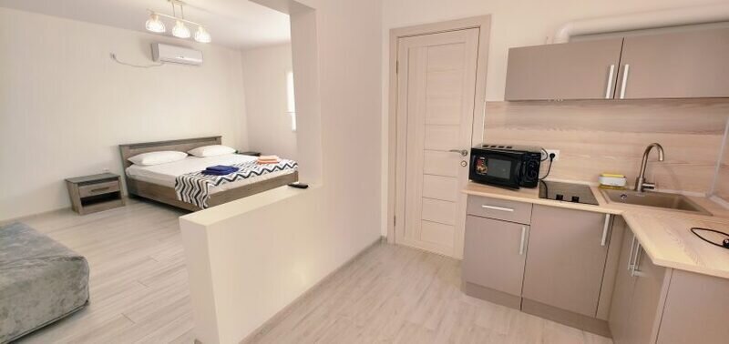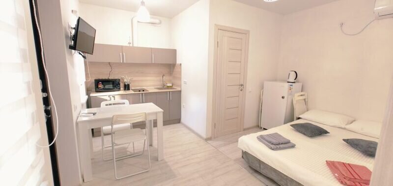 Уютная светлая студия с двуспальной кроватью и кресло-кроватью, платяным шкафом, прикроватными тумбами, кондиционером, телевизором. Номер с кухней (электроплитка, холодильник, чайник, микроволновая печь, обеденная зона и посуда).В номере собственная ванная комната и предусмотрен фен.