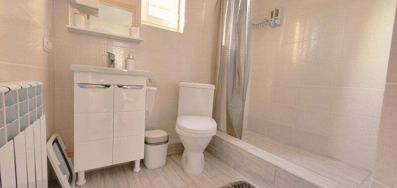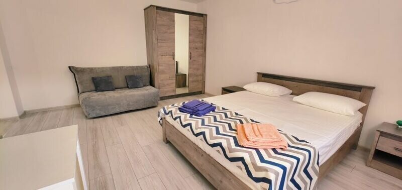 Просторная студия с двуспальной кроватью и двуспальным диваном, платяным шкафом, прикроватными тумбами, кондиционером и телевизором. В номере расположена кухня (электроплитка, холодильник, чайник, микроволновая печь, обеденная зона, рабочая зона и посуда). В номере собственная ванная комната и предусмотрен фен.