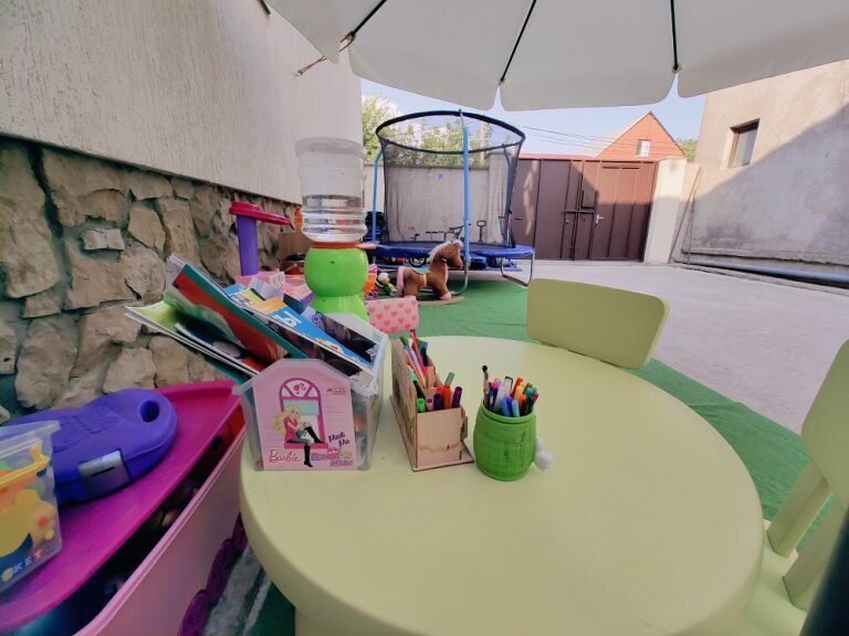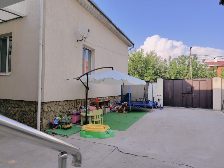 На территории дома оборудована мангальная зона, общая кухня с зоной отдыха, детская площадка, батут, самокаты и велосипеды для активного отдыха.