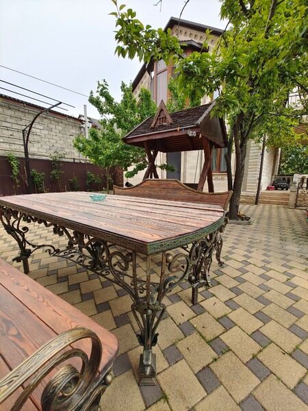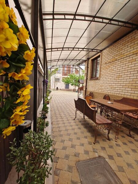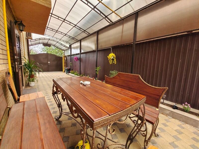 Во дворе есть зона для отдыха со столами и стульями
