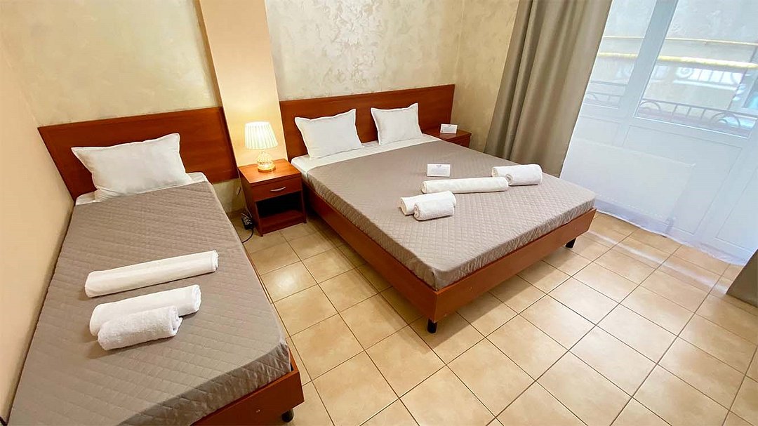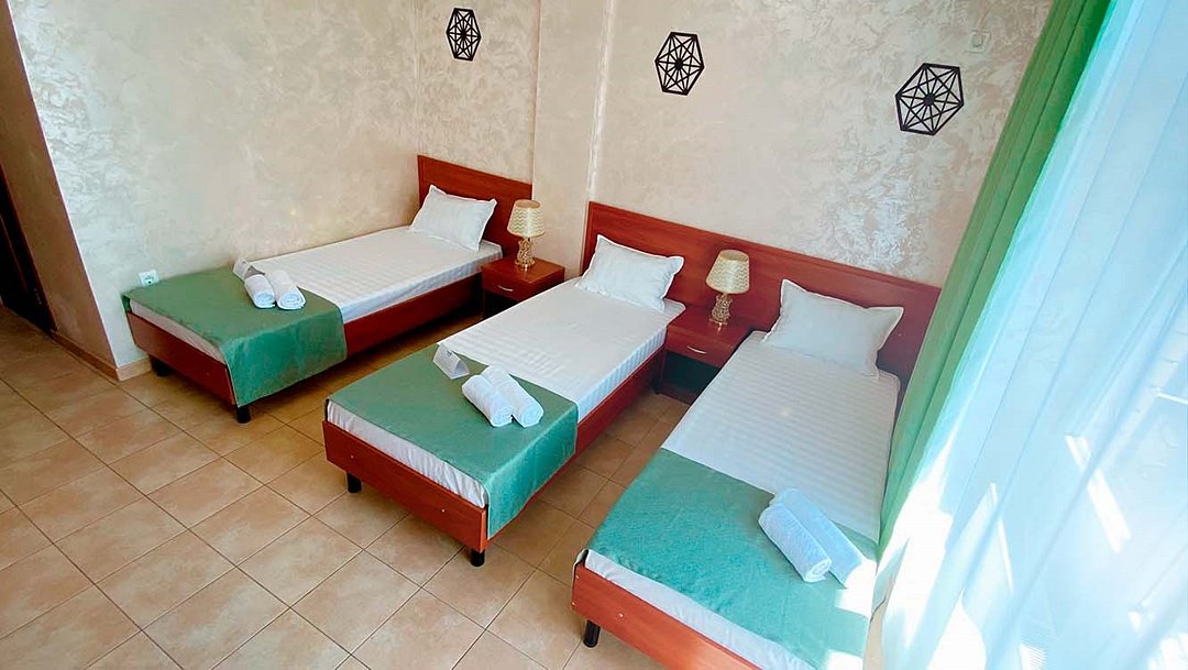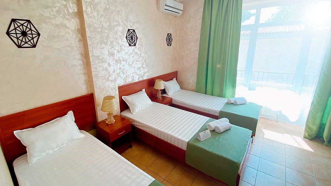 В этом просторном номере каждый гость получает личное спальное место — три полноценные односпальные кровати. Здесь созданы все условия для комфортного отдыха после насыщенного дня. Основные удобства в номере: Для сна и отдыха: Три односпальные кровати, зона с диваном и журнальным столиком, телевизор, кондиционер. Для работы и быта: Письменный стол со стулом, бесплатный высокоскоростной Wi-Fi, просторный шкаф для вещей. В собственной ванной комнате: Комплект полотенец для каждого гостя, фен, косметическое зеркало, туалетные принадлежности, тапочки.Услуги и удобства