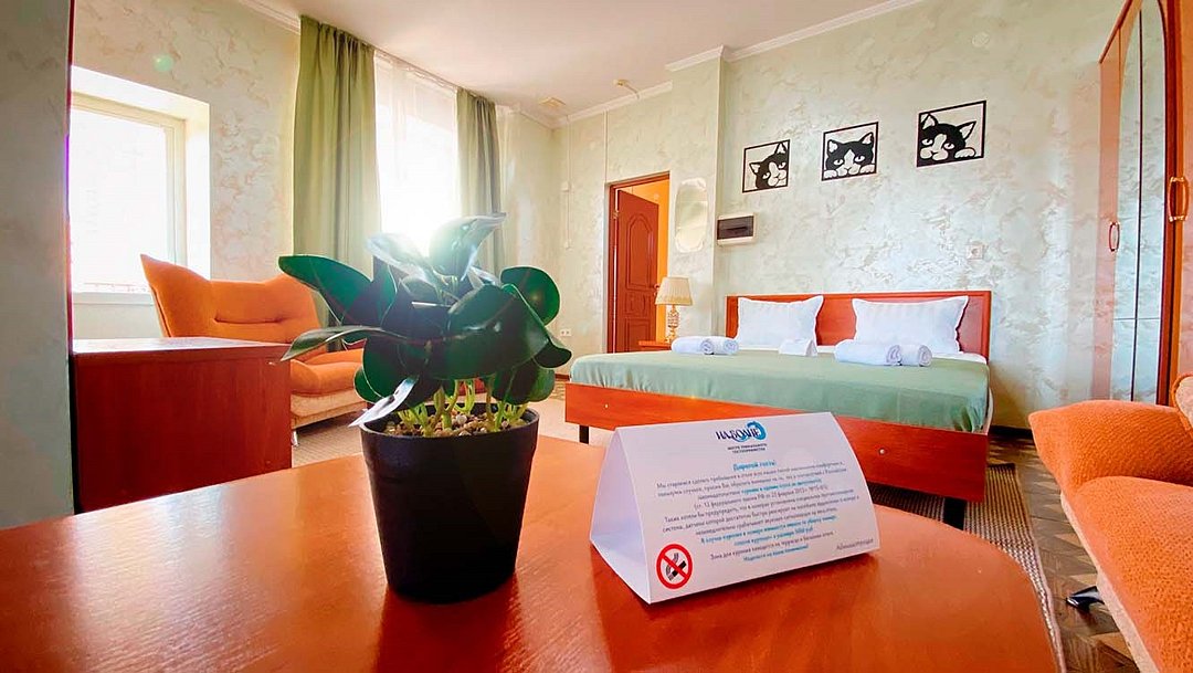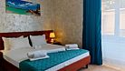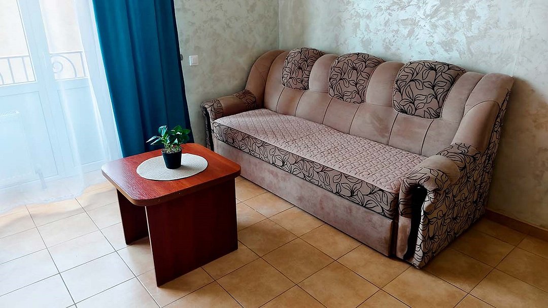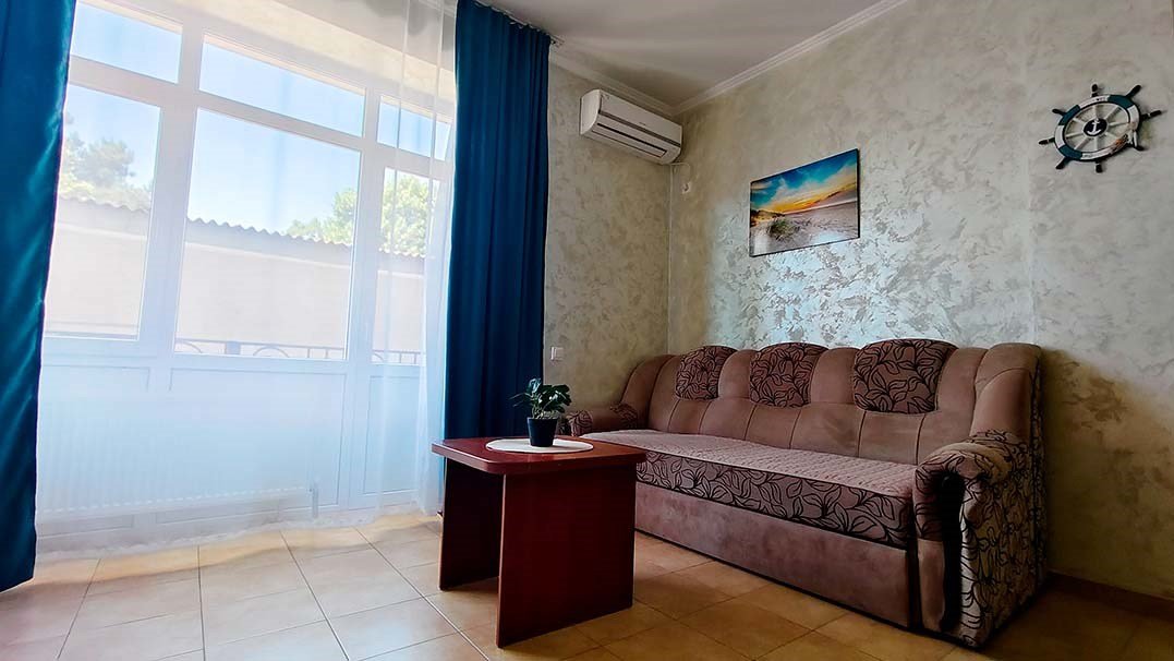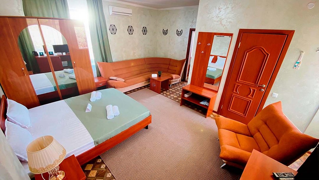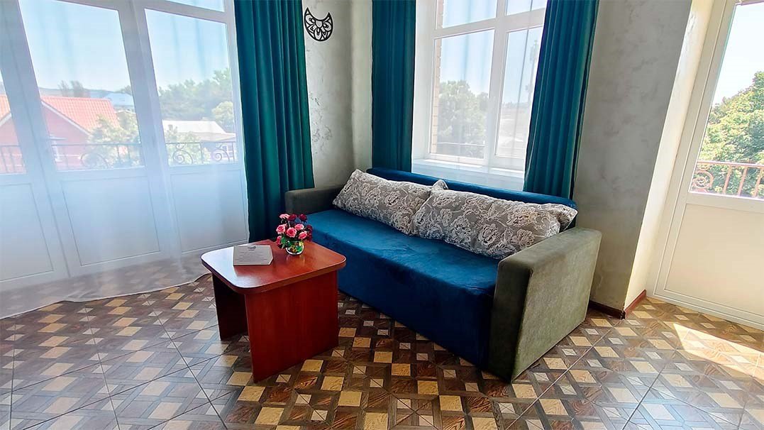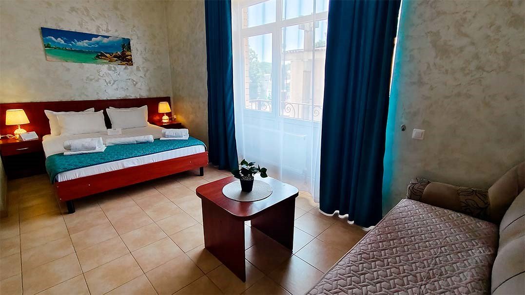 Просторный номер, который подходит как для отдыха пары, так и для семьи с одним или двумя детьми. Главная особенность — большая двуспальная кровать класса и полноценный раскладной диван, который по запросу превращается в дополнительную двуспальную кровать. В номере: кондиционер, телевизор, холодильник, чайник, бесплатный Wi-Fi, шкаф, зеркало, стол и стул, журнальный столик, прикроватная тумба, торшер. Ванная комната: комплект полотенец, фен, косметическое зеркало, туалетные принадлежности, тапочки.Услуги и удобства