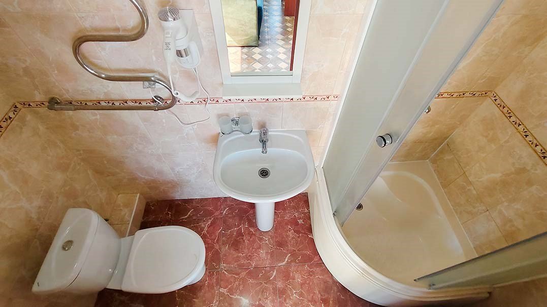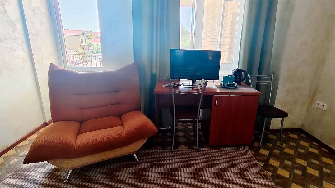 «Семейный номер» — уютное пространство для родителей и ребенка Идеальный выбор для семьи, путешествующей с ребенком. Этот номер предлагает комфортную конфигурацию: большая двуспальная кровать для родителей и отдельная односпальная кровать для ребенка. Оснащение номера: Для отдыха и развлечений: Мягкий диван, телевизор с широким выбором каналов, кондиционер. Для удобства: Холодильник, электрочайник, бесплатный высокоскоростной Wi-Fi, письменный стол, просторный шкаф. Ванная комната: Комплект пушистых полотенец для всех гостей, фен, туалетные принадлежности, тапочки.Услуги и удобства