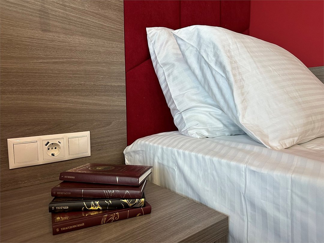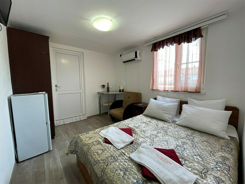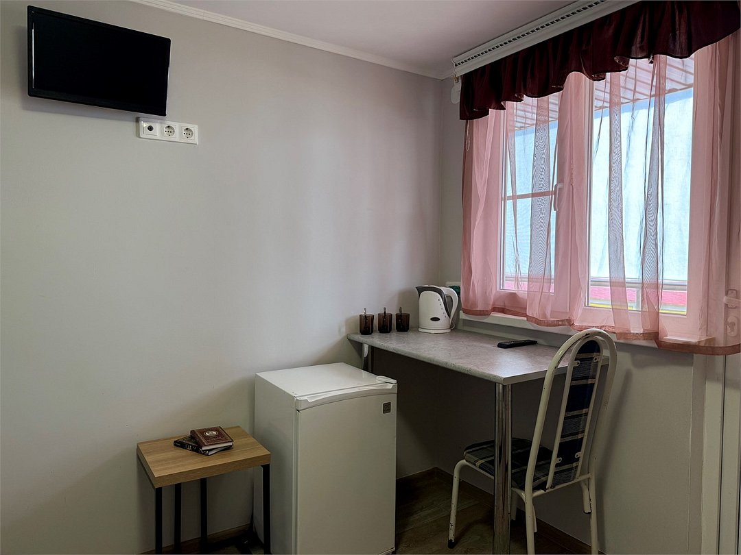 Бюджетный двухместный номер с 1 кроватью - это однокомнатный номер площадью 9 кв.м. В номере одна двуспальная кровать, сплит-система, ж/к телевизор с цифровыми каналами, электрический чайник, холодильник, стенной шкаф. На этаже располагается общая ванная комната.Услуги и удобства