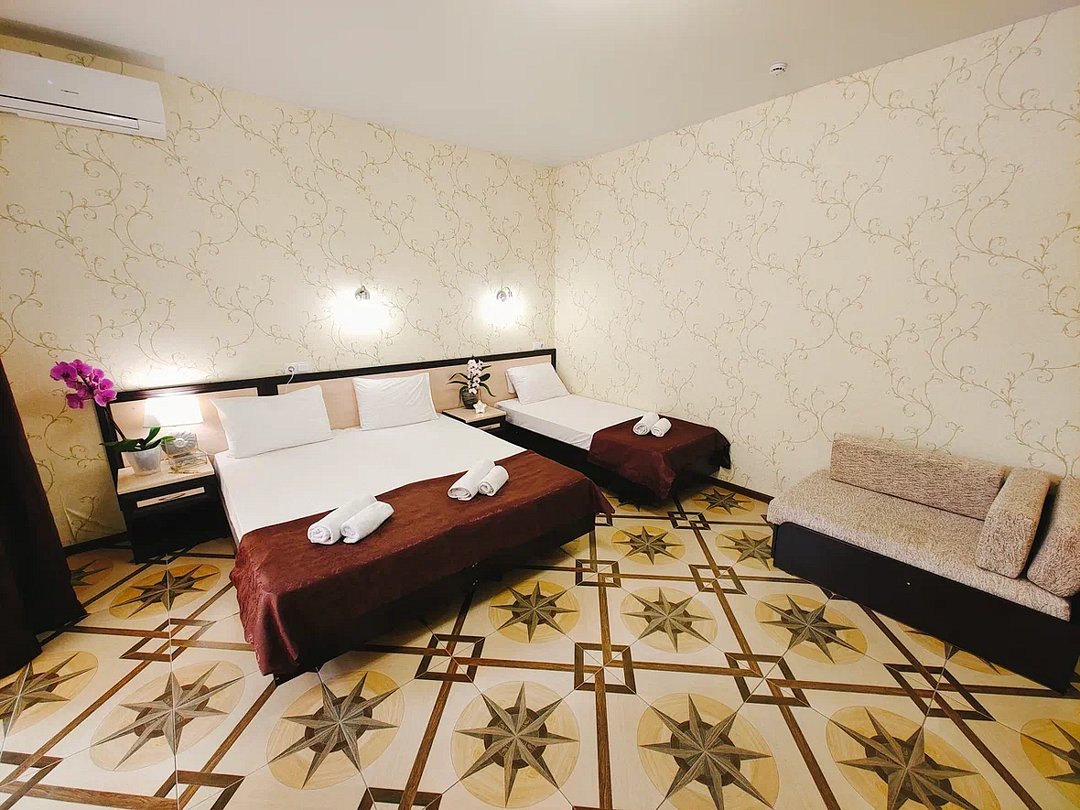 Двуспальная кровать, 2 односпальные кровати, прикроватная тумбочка, туалетный столик, шкаф, ТВ, кондиционер, мини-холодильник, чайник, сушка, ванная комната с душевой кабинкой, индивидуальный внутренний дворик с мебелью.