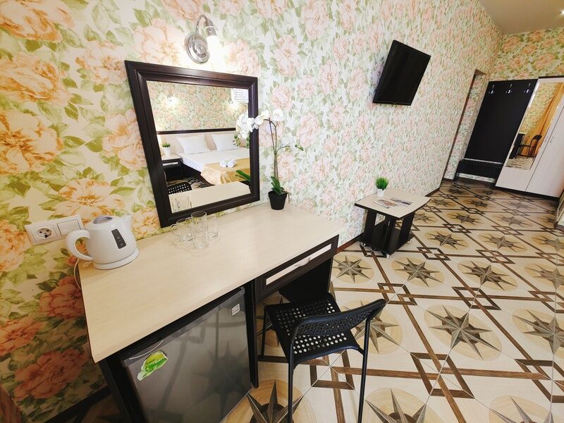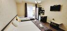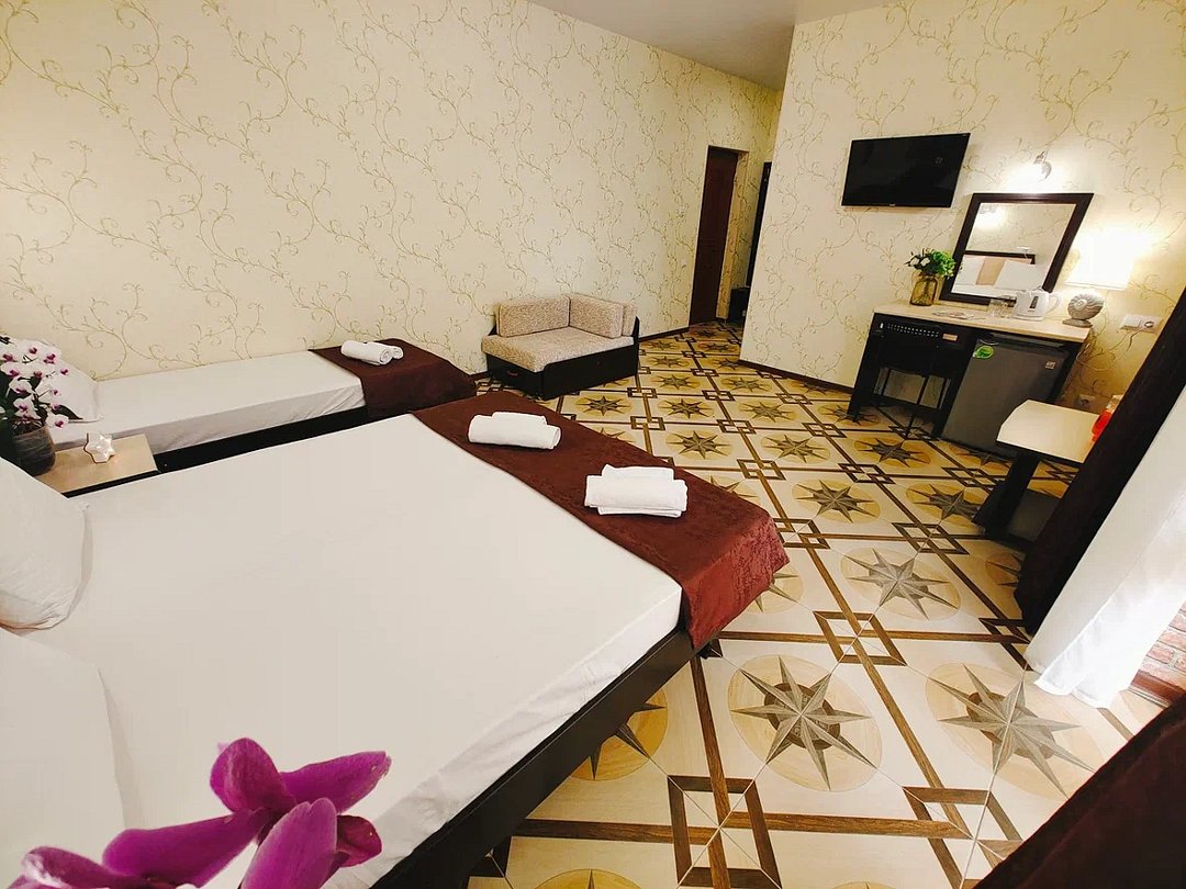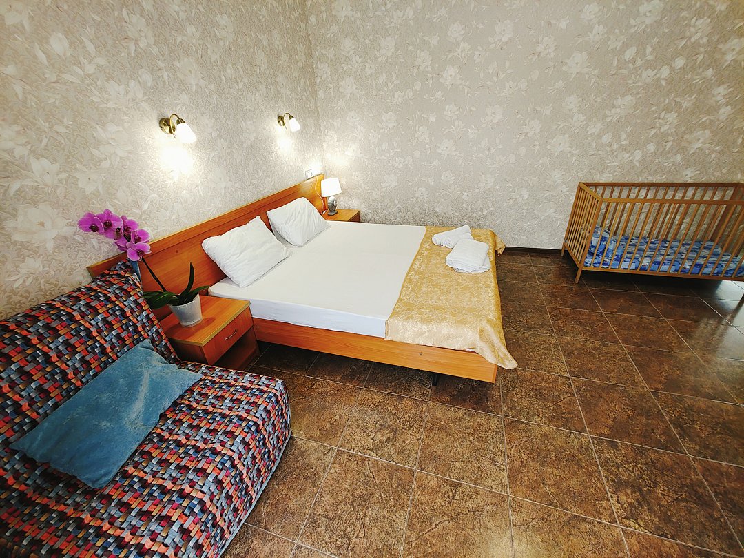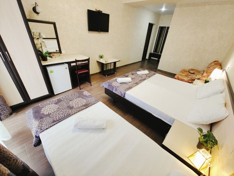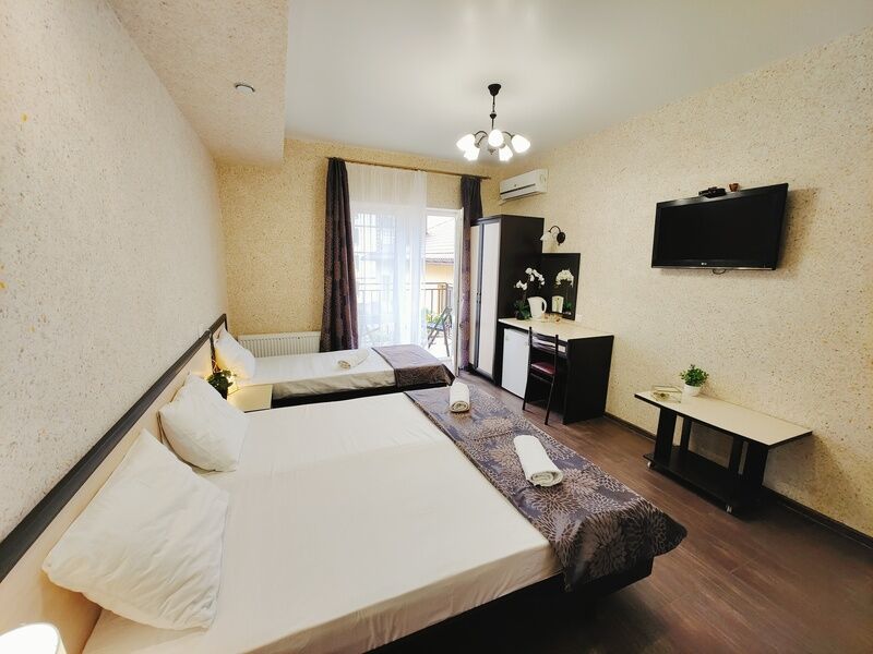 Двуспальная кровать, односпальная кровать, двуспальный раскладной диван, прикроватная тумбочка, туалетный столик, вешалка, шкаф, кондиционер, мини-холодильнк, телевизор, ванная комната с душевой кабинкой, балкон.