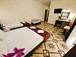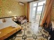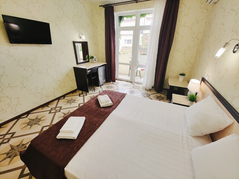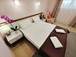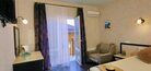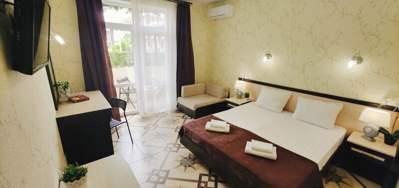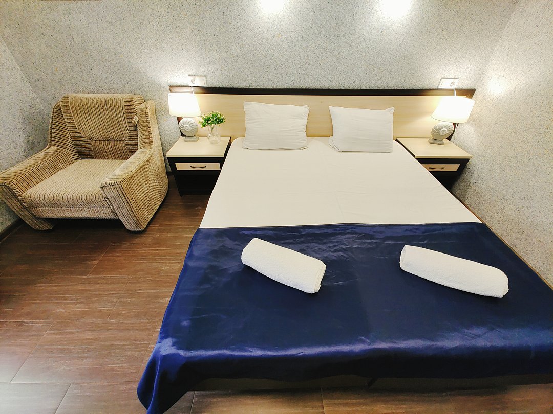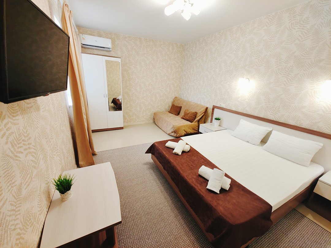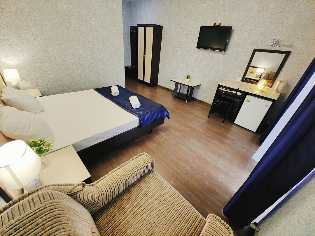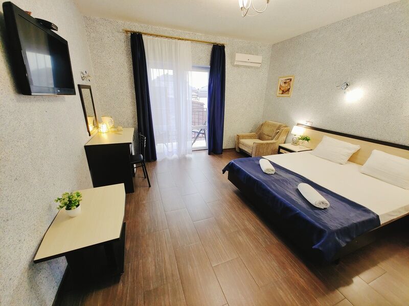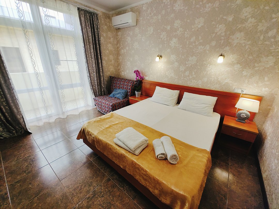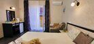 Двуспальная кровать, кресло-кровать, прикроватная тумбочка, туалетный столик, вешалка, шкаф, кондиционер, мини-холодильнк, телевизор, ванная комната с душевой кабинкой, балкон.