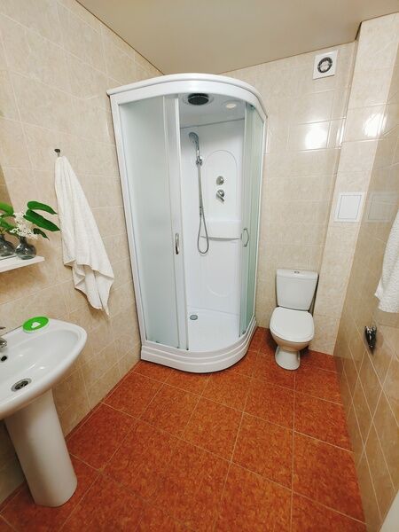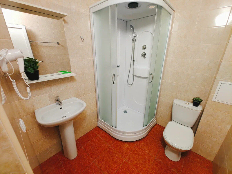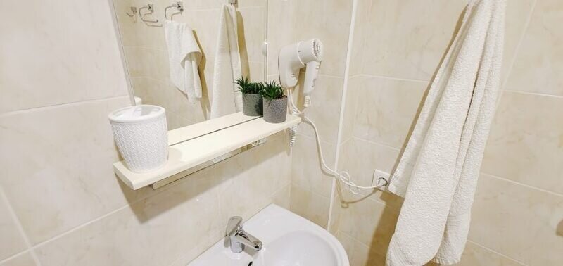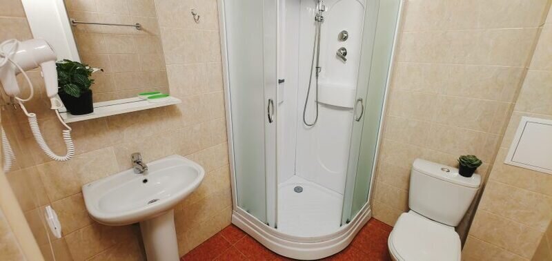Ванная: душевая кабина/ванная, туалет, раковина, зеркало, стиральная машина, гладильная доска, утюг.