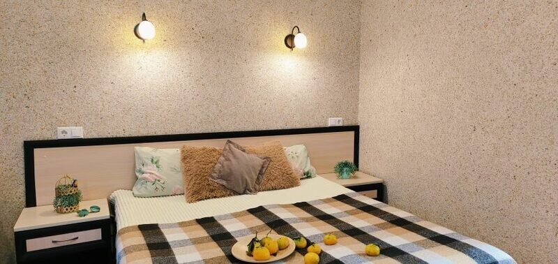 Двуспальная кровать, односпальная кровать, прикроватная тумбочка, туалетный столик, шкаф, ТВ, кондиционер, мини-холодильник, чайник, сушка, ванная комната с душевой кабинкой, индивидуальный внутренний дворик с мебелью.