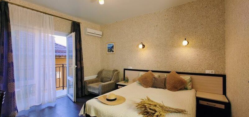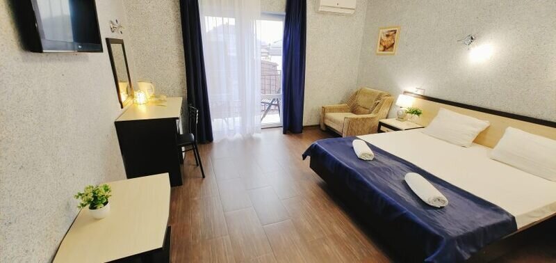 Самолетом до аэропорта г. Анапа, далее на маршрутном такси №113 до остановки «Аквапарк», далее на маршрутном такси №114 до остановки «Аквамарин», далее пройти пешком 261 м до отеля.