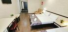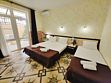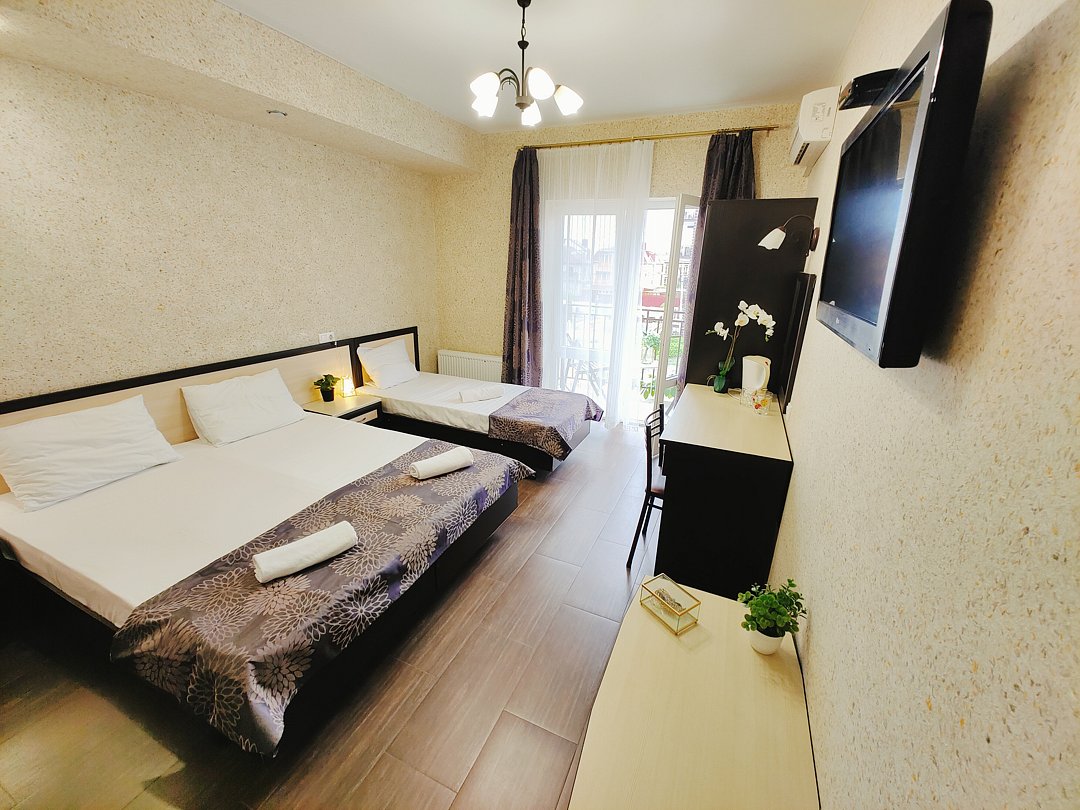 Двуспальная кровать, односпальная кровать, кресло-кровать, прикроватная тумбочка, туалетный столик, вешалка, шкаф, кондиционер, мини-холодильнк, телевизор, ванная комната с душевой кабинкой, балкон.