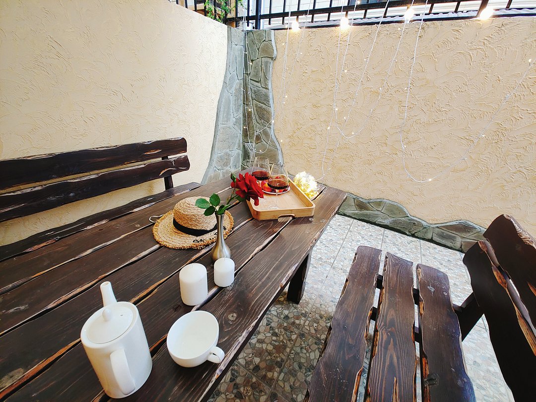 Двуспальная кровать, прикроватная тумбочка, туалетный столик, шкаф, ТВ, кондиционер, мини-холодильник, чайник, сушка, ванная комната с душевой кабинкой, индивидуальный внутренний дворик с мебелью.