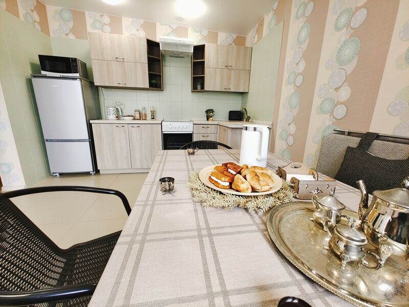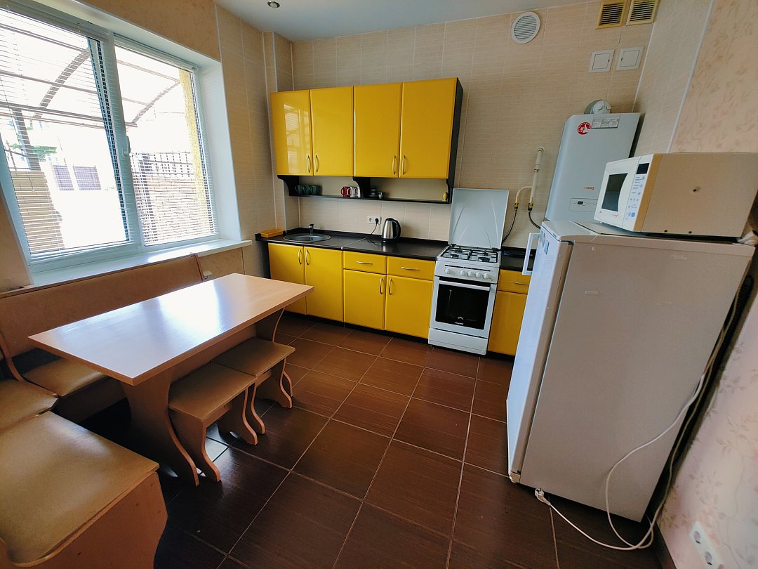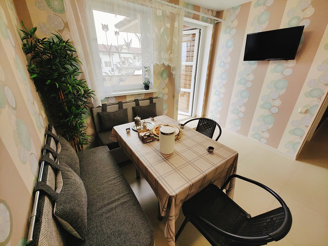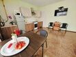 Кухня-гостиная: кухня, холодильник, плита, СВЧ печь, диван-кровать, чайник, посуда, обеденная зона, ТВ- триколор.