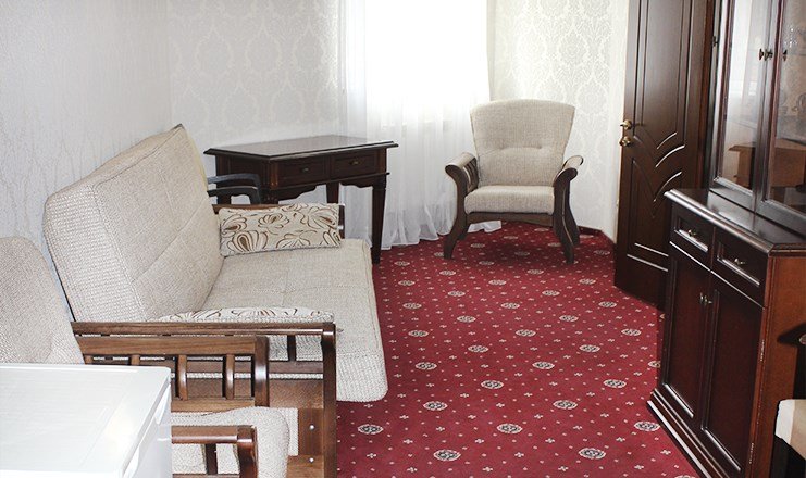 Номер люкс состоит из двух комнат (гостиной и спальни), рассчитан на проживание двух и более человек. Он имеет балкон, выходящий на ул. Горького (пешеходная). Во всех номерах, где есть балконы имеются столики и стулья. В номере есть санузел, оборудованный душем. Номер оснащен телевизором, холодильником, сплит - системой, отопительным радиатором (с регулировкой степени нагрева), феном. Предусмотрены комплекты из трех полотенец (на каждого проживающего), гигиенические наборы.Услуги и удобства