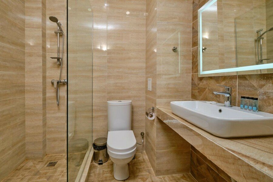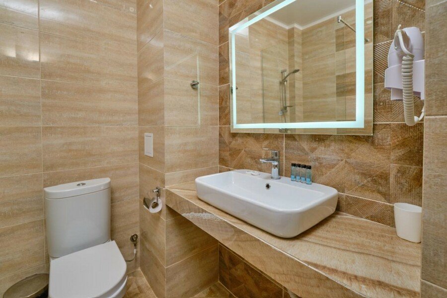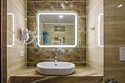 Индивидуальная ванная комната: душ, раковина, туалет. Сюит — двухкомнатный номер площадью 42 м² с видом во двор.