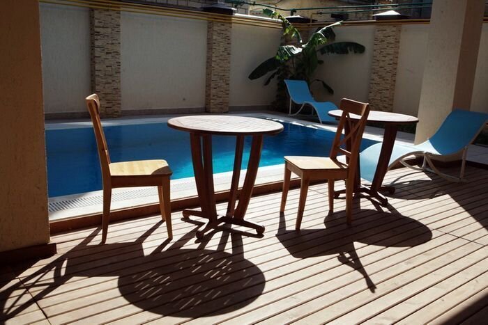 Бассейн оборудован площадкой, где можно принять солнечные ванны, выпить чашечку кофе или коктейль.