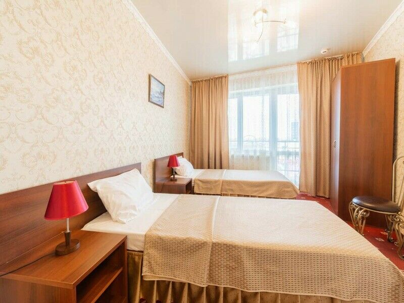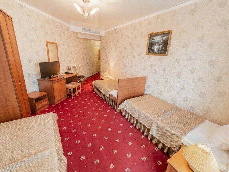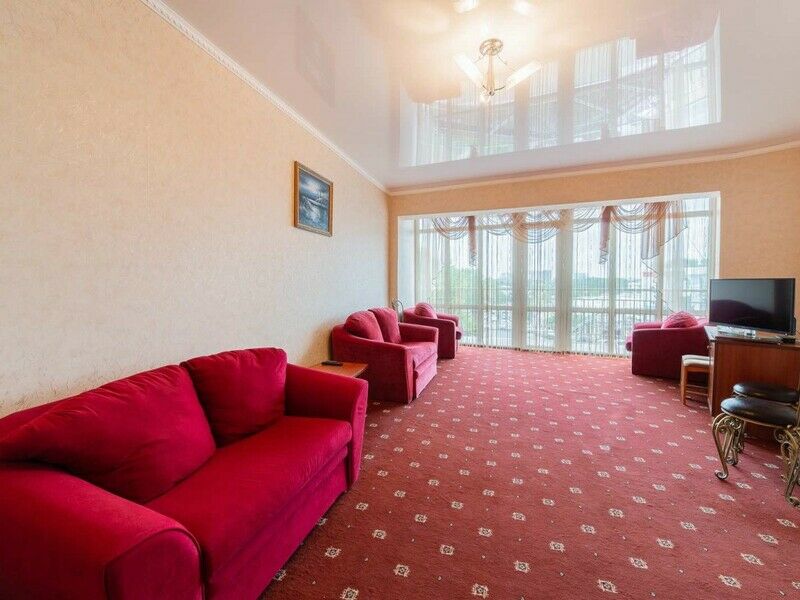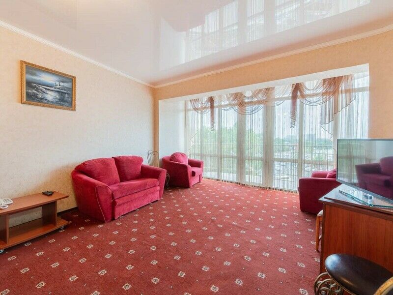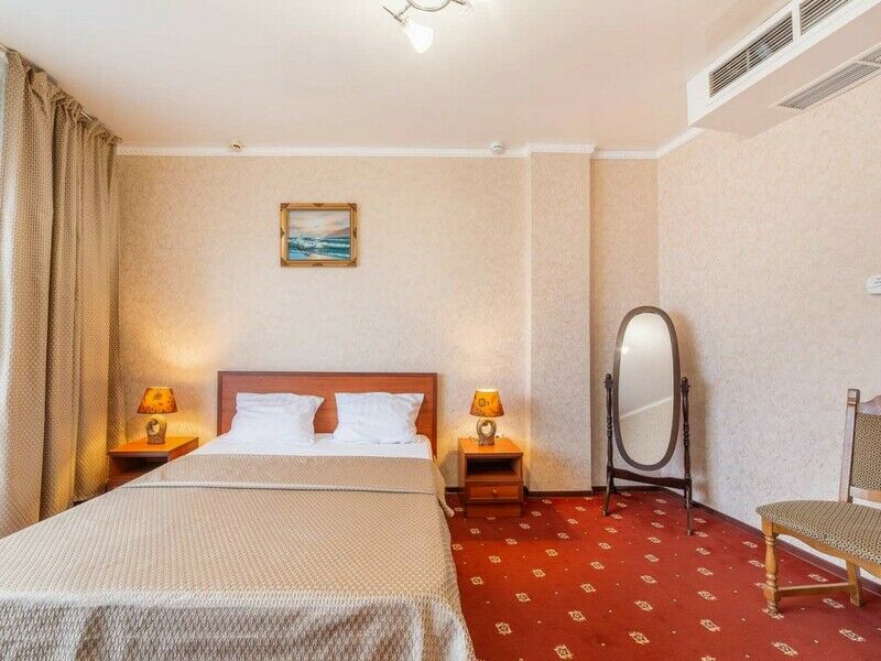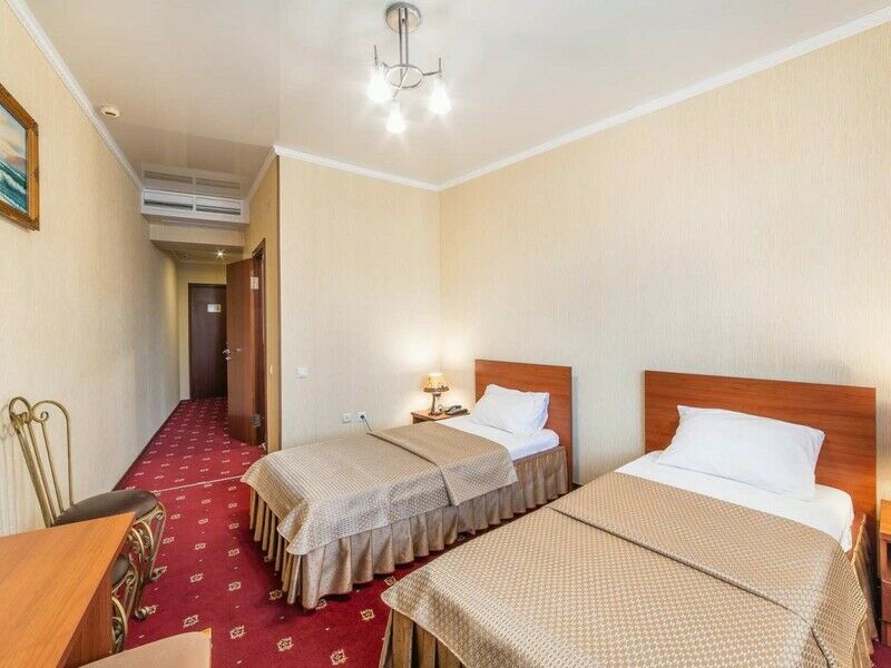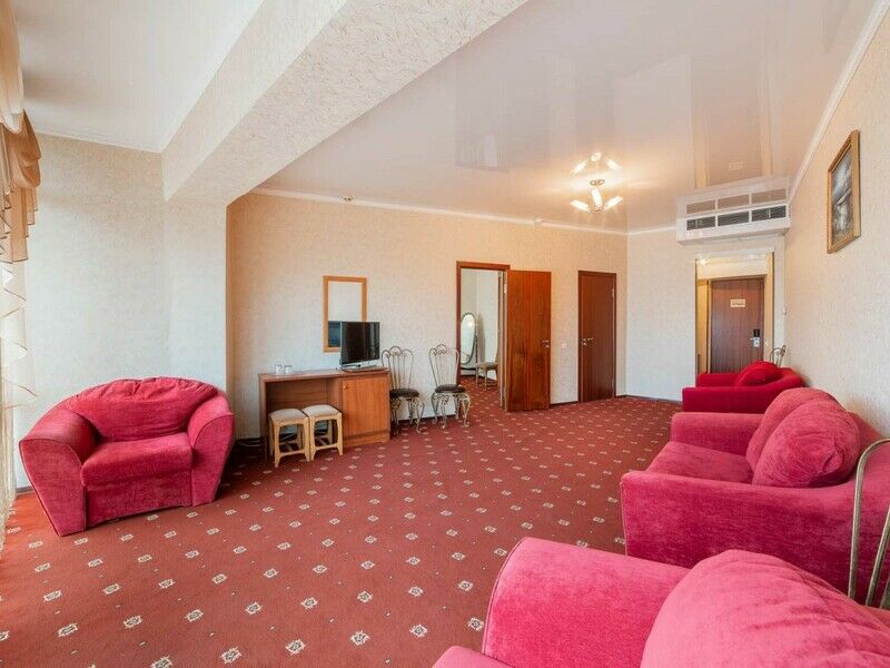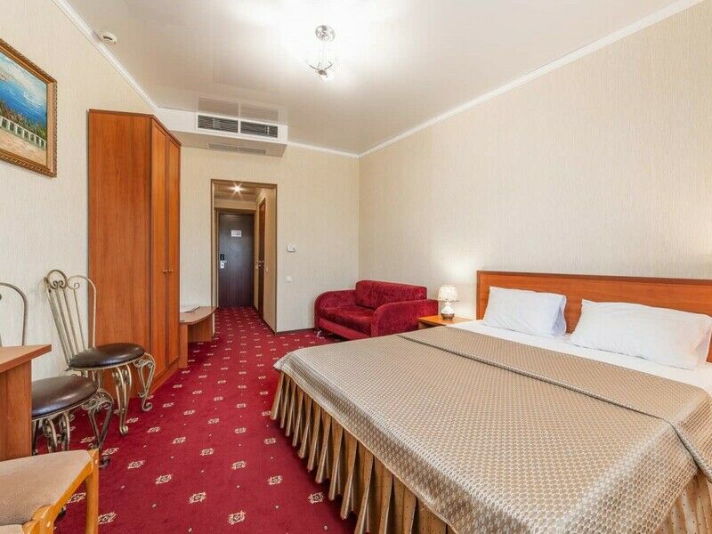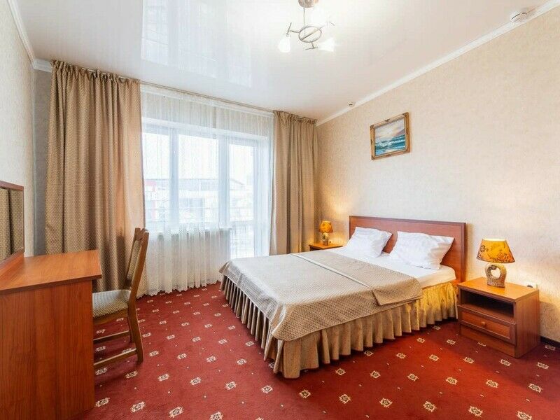 Здание состоит из пяти этажей. В нем может одновременно проживать 80 отдыхающих. Жилой фонд представлен номерами трех категорий: стандарт, апартаменты, люкс. Они декорированы в приятных теплых тонах. Во всех номерах есть санузлы, душевые кабины, кондиционеры, телевизоры и другая необходимая для комфортного проживания техника.