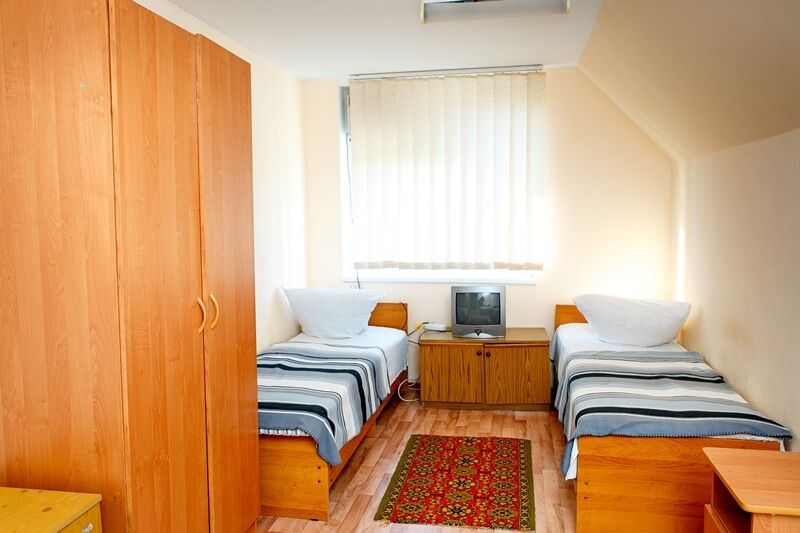 Мебель: односпальные кровати, стулья, шкаф, прикроватные тумбочки, вешалка, зеркало.