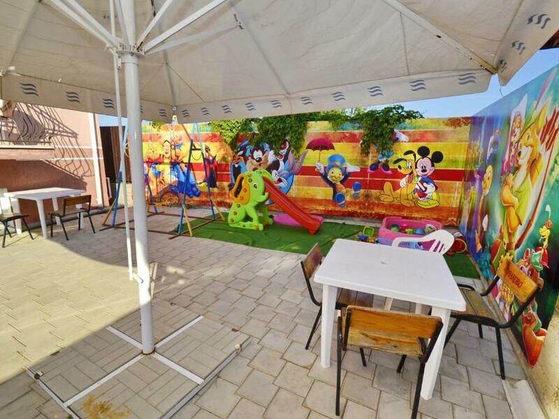Во дворе находится бассейн. Как для взрослых так и детей. Бар. Анимация для детей раз в неделю. Можешь готовить шашлыки.