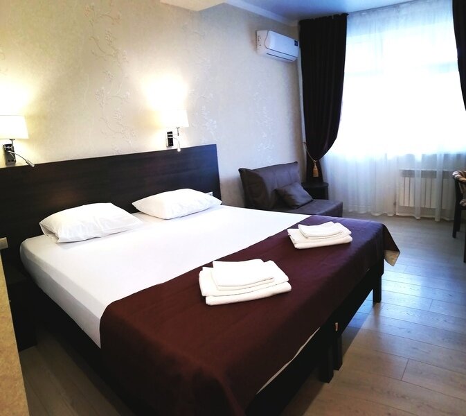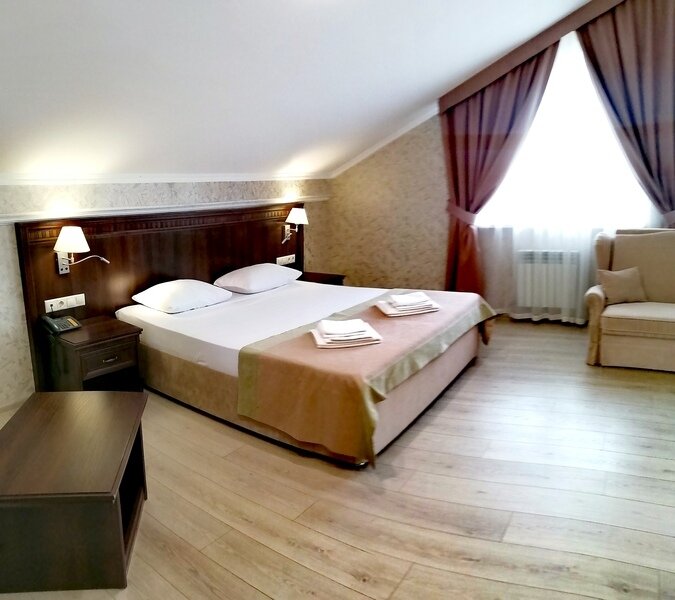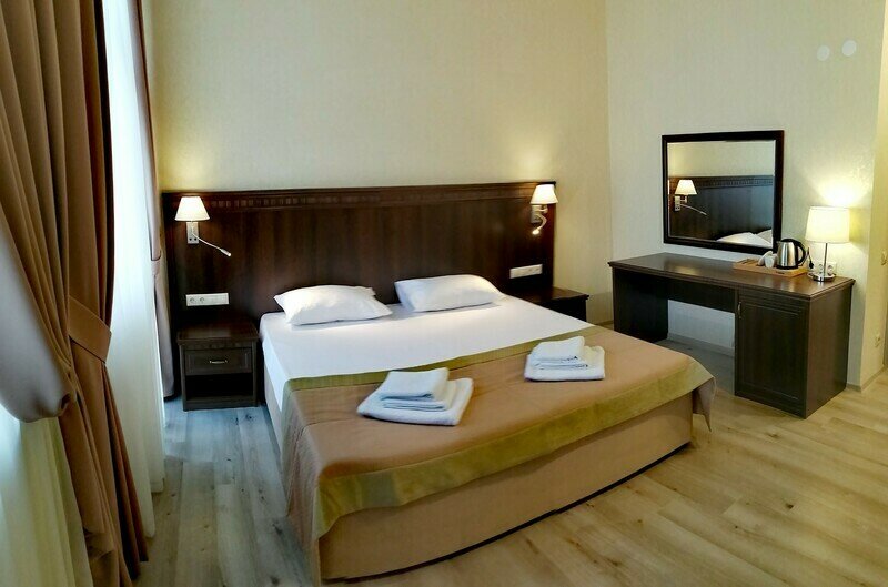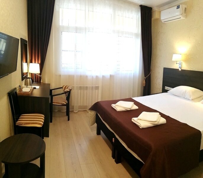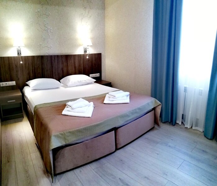 Двухместный номер с одной большой кроватью или двумя односпальными кроватями. В номере есть всё необходимое для комфортного проживания одного или двух гостей: прихожая, шкаф, стол, стул, прикроватные тумбочки, журнальный столик, зеркало, телевизор.