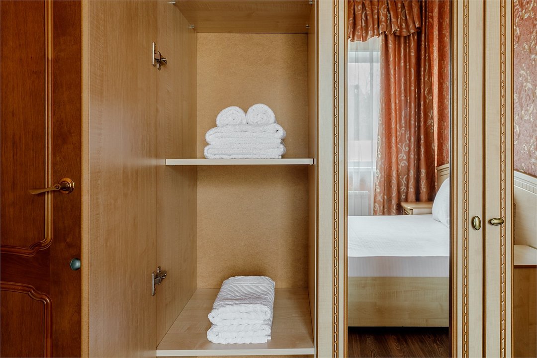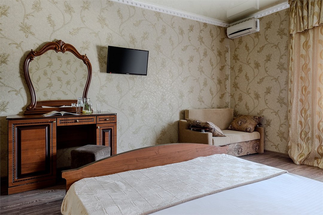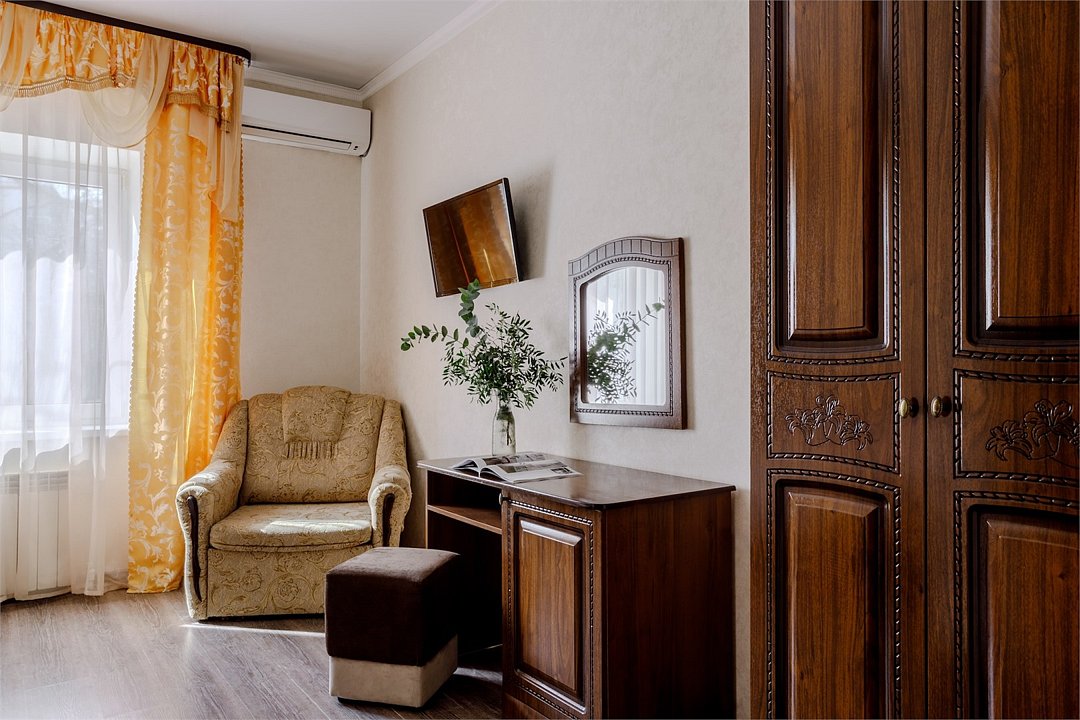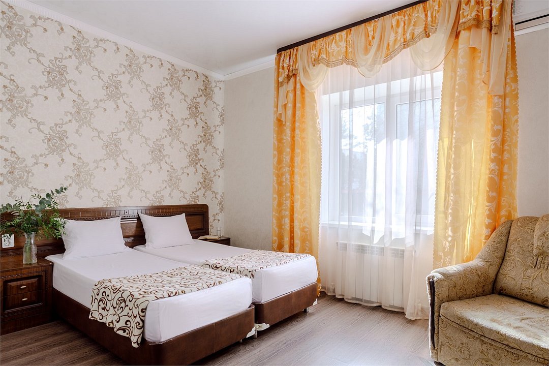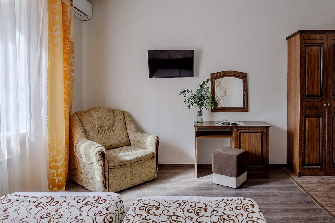 Стандартный номер площадью 22 квадратных метров. На выбор гостей спальные места в комнате представлены: одной двуспальной кроватью или двумя односпальными кроватями. Для размещения третьего гостя имеется дополнительное спальное место – кресло-кровать (шириной 80 см). В номере есть: Wi-Fi, сплит-система, стол, современный телевизор и фен. Номер оснащен собственной ванной комнатой с душем, туалетом и косметическими принадлежностями.Улучшенный номер